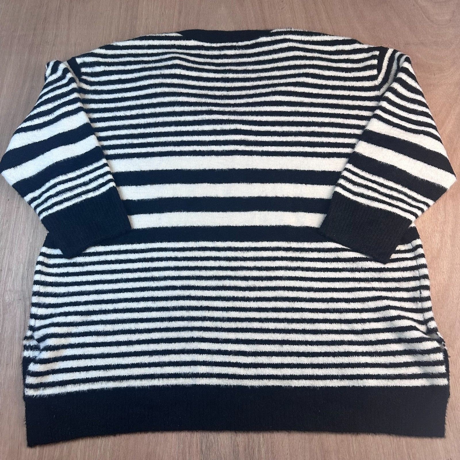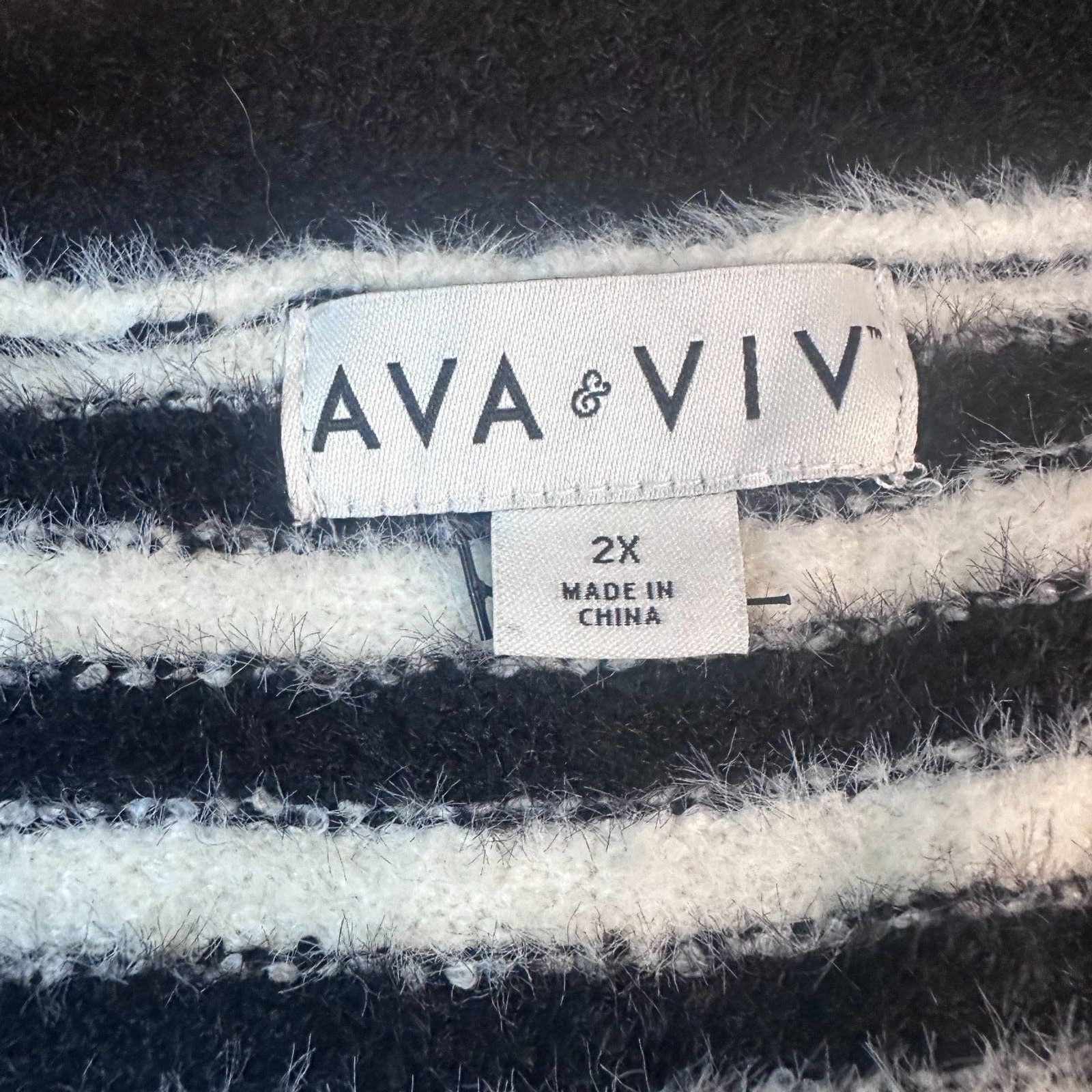 Cozy and stylish Ava & Viv plus-size striped sweater in classic black and white. Made with a soft fuzzy knit that’s perfect for fall layering. Features a flattering V-neck, mid-length sleeves, and an easy relaxed fit. Comfortable and versatile — dress it up with slacks or keep it casual with jeans. Brand: Ava & Viv (Target Women’s Plus Line) Size: 2X Color: Black & White Stripes Material: 60% Nylon, 39% Recycled Polyester, 1% Spandex Style: Fuzzy Knit Striped Sweater Condition: Pre-owned, good condition, no major flaws noted Measurements (approximate, laid flat): Pit to Pit: 28" Length: 29" Perfect for casual wear, office layering, or weekend looks #FallFashion #AvaAndViv #PlusSizeStyle #CozySweater