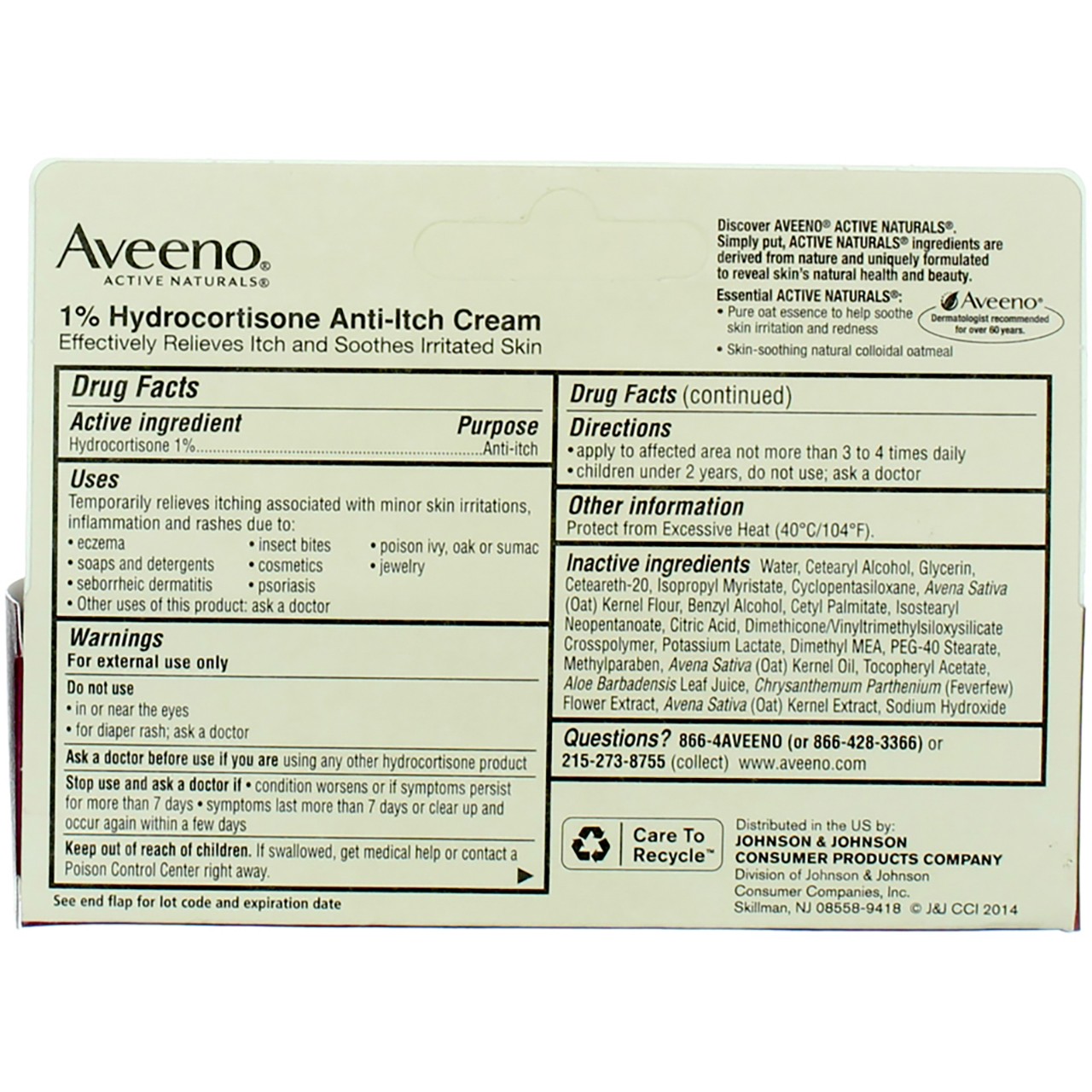 Product Description Aveeno 1 percent Hydrocortisone Anti-Itch Cream is a maximum-strength formula for effective, longer-lasting itch relief. It provides temporary relief from the itching associated with minor skin irritations, inflammation, rashes due to eczema, seborrheic dermatitis, psoriasis, insect bites, poison ivy/oak/sumac, soaps, detergents, cosmetics, or jewelry. Ingredients This cream contains 1 percent hydrocortisone, aloe, vitamin E, and Active Naturals Triple Oat Complex. Product Description Aveeno 1 percent Hydrocortisone Anti-Itch Cream is a maximum-strength formula for effective, longer-lasting itch relief. It provides temporary relief from the itching associated with minor skin irritations, inflammation, rashes due to eczema, seborrheic dermatitis, psoriasis, insect bites, poison ivy/oak/sumac, soaps, detergents, cosmetics, or jewelry. Ingredients This cream contains 1 percent hydrocortisone, aloe, vitamin E, and Active Naturals Triple Oat Complex. Disclaimer The product descriptions and instructions provided by vitabox.com are for informational purposes only and are qualified in their entirety by the information available from manufacturers of the products. You should carefully read all product packaging, and contact the manufacturer with any questions before using a product. While we endeavor to ensure that product descriptions are current, manufacturers sometimes change their products. We are not liable for inaccuracies or misstatements about products. We do not provide medical advice or recommendations. You should not use the information provided by vitabox.com for diagnosing or treating a health problem or disease. If you have or suspect that you have a medical problem, immediately contact your health care provider. Information and statements regarding dietary supplements have not been evaluated by the Food and Drug Administration or any other government agency and are not intended to diagnose, treat, cure, or prevent any disease.