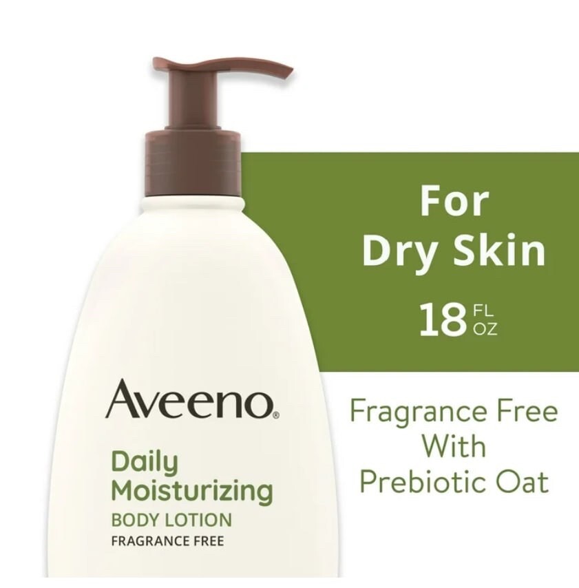 Aveeno Daily Moisturizing Body Lotion and Facial Moisturizer , 18 oz. • Aveeno Daily Moisturizing Body Lotion with soothing prebiotic oat intensely nourishes dry skin • Gentle lotion, suitable for sensitive skin, has clinically proven moisturization that lasts 24 hrs • Moisturizing body lotion nourishes & helps replenish skin's natural moisture barrier • Unique formula contains soothing prebiotic oat and locks in moisture to nourish dry skin