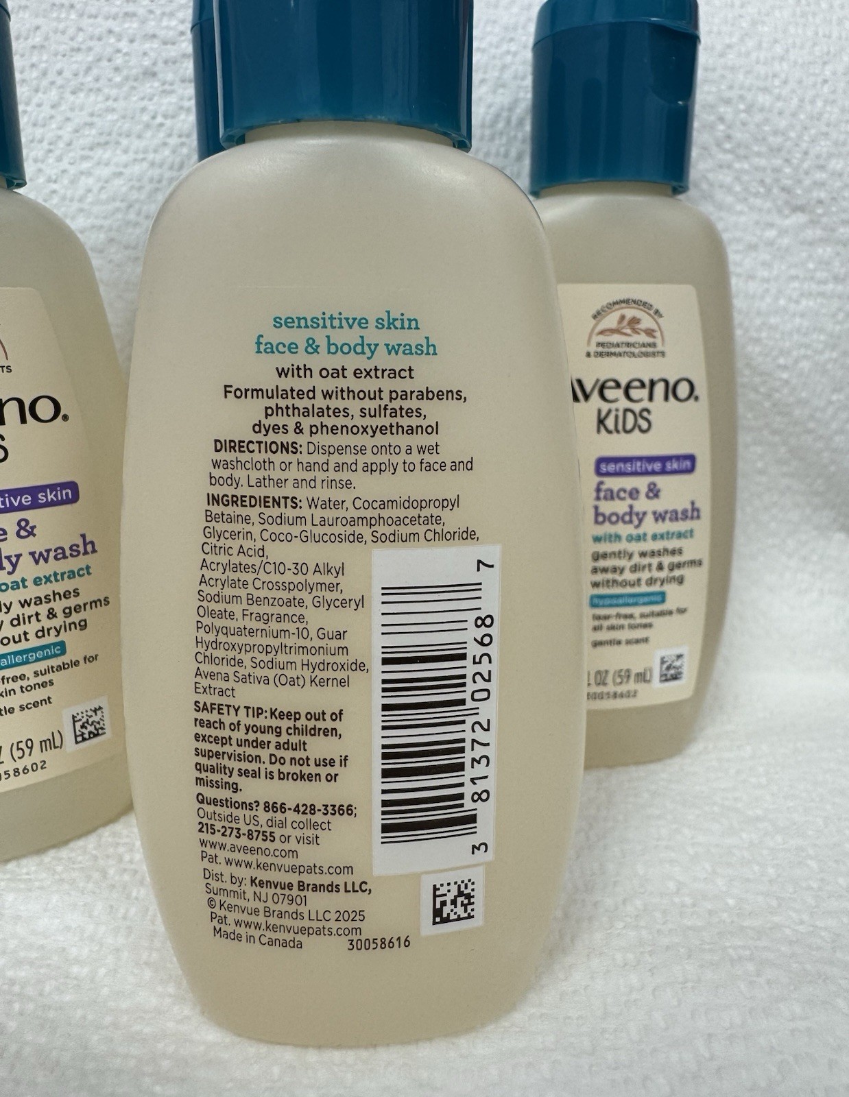 UPC:0381372025687Type:Face & Body WashBody Area:FaceVolume:8 fl ozStyle:Wash + Gel CreamBrand:KenvueIngredients:Glycerin, Water, Oat ExtractItem Weight:532 GramsItem model number:30050752Skin Type:Sensitive Skingtin13:0381372025687Scent:Face & Body WashSize:4 Bottles Of 2 fl ozProduct Dimensions:2.87 x 0.13 x 6.22 inches; 1.17 PoundsAge Range (Description):ChildManufacturer:Kenvue