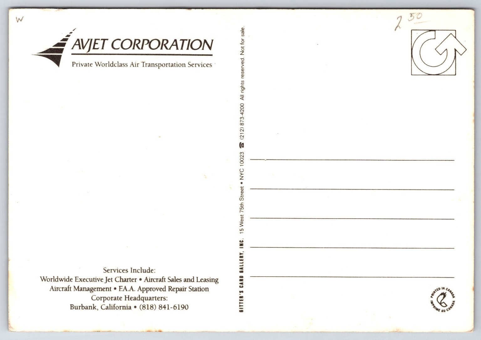 This vintage photochrome postcard features an impressive lineup of private jets in front of the Avjet Corporation hangar, showcasing the luxury and sophistication of private air travel. The image highlights multiple aircraft parked on the tarmac with the Avjet logo prominently displayed on the hangar, emphasizing the company's full-service aviation offerings. The postcard captures the essence of mid-to-late 20th century executive jet travel. Produced by Gitter's Card Gallery and printed in Canada, this 6 x 4 inch postcard was designed to promote Avjet Corporation's worldwide executive jet charter, aircraft sales, leasing, and FAA-approved repair station services. With its clear branding and professional aviation imagery, it serves as a collectible piece for aviation enthusiasts and postcard collectors alike, representing a unique slice of aviation history centered in Burbank, California. SHIPPING COST: ALL ORDERS ARE EXPIDITED, ORDERS ARE TYPICALLY SHIPPED WITHIN TWO HOURS OF MY RECEIPT OF PAYMENT UNLESS I AM OUT OF TOWN SOURCING NEW ITEMS OR MY STORE IS IN VACATION MODE BOTH OF THESE MITIGATING FACTORS ARE RARE. SEE MULTIPLE SCANS OF ITEM. Please use eBay magnifier for a more detailed view of the item. CONDITION: Moderate wear and some soiling. Combined shipping always available on multiple items. PLEASE USE THE E-BAY SHOPPING CART AS IT MAKES COMBINED SHIPPING EASIER TO SEE. Thank you! I have a great passion for collecting postcards, photographs and ephemera. My store offers many rare and hard to find items as well as always being able to guarantee their authenticity as vintage and genuine. Each week I will be posting rare, unusual, high-quality and unique items for the advanced, intermediate and beginning collector. Our items are ALWAYS vintage. Please bookmark our store and I look forward to helping you build your collections!