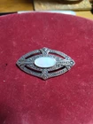 This vintage Avon brooch pin from 1987 features a Victorian Revival design with a faux mother of pearl oval stone surrounded by faux marcasite accents. The elegant piece is signed by Avon and showcases a bezel setting style, adding to its beauty and charm. Perfect for special occasions like Mother's Day, Christmas, weddings, anniversaries, birthdays, and Valentine's Day, this brooch exudes timeless elegance and sophistication with a touch of vintage flair.