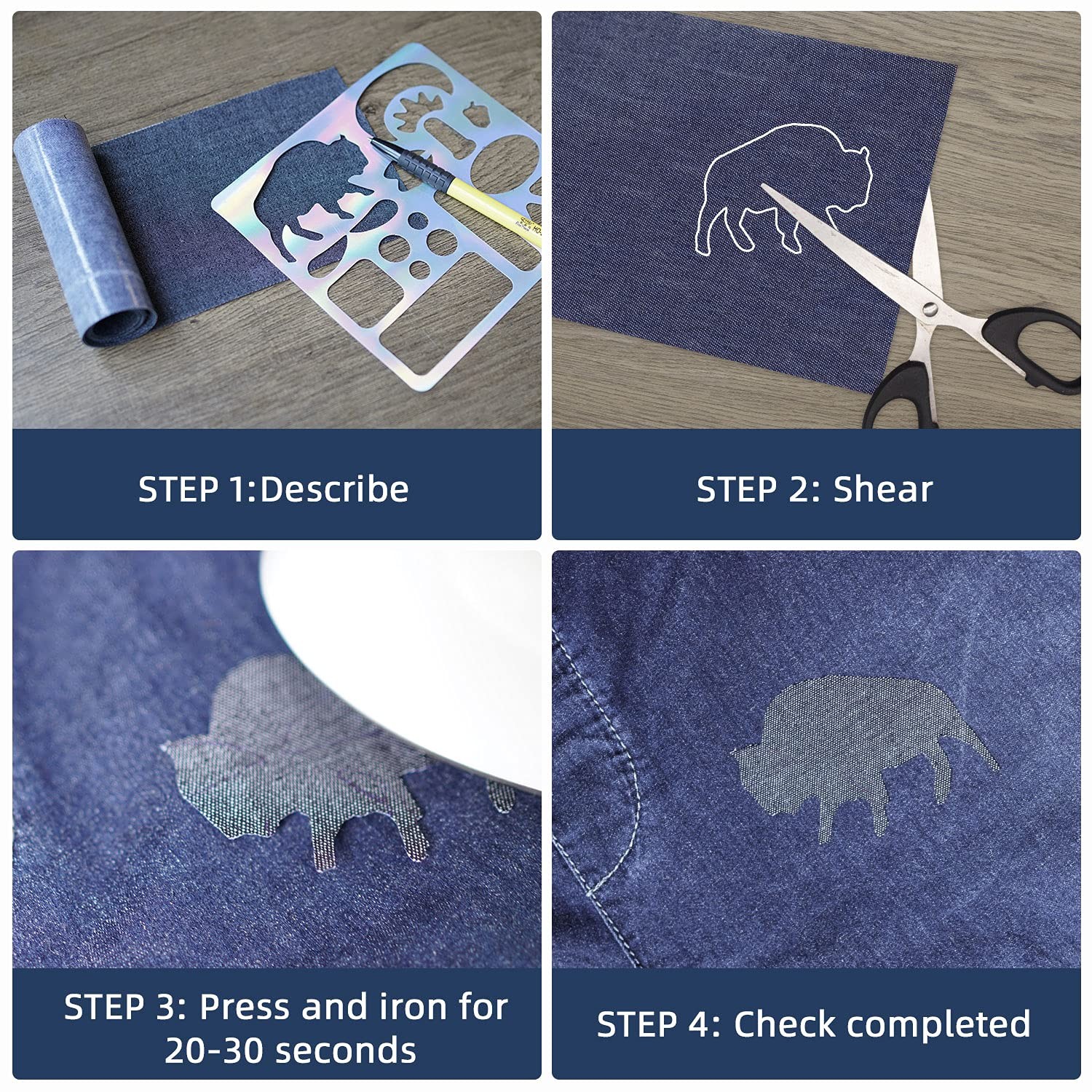 Specifications: 4”* 60” / 1 roll Colors: Black, Dark blue, Light blue How to use: 1. Use a pencil to draw the desired shape on the patch and cut. 2. Preheat the iron to 180 (℃)/356 (℉), then place the patch in the desired position, then iron the patch for 15-20 seconds. 3. You can also attach patches from the inside of the jeans so the reverse side of the patch will show through the holes. After a few washes, the shiny glue will disappear and look like regular fabric. 4. For better performance, you can also sew it on. NOTES: Do not iron patches with hair straighteners or other heated objects. Use an iron instead. Size of denim patches: 4”x60”/1 roll is the perfect size and it will help to hide the both small and large holes perfectly and enough to create your own design. Strongest Glue: It only takes a few minutes of ironing to repair or decorate your jeans. The denim patch is made from 100% cotton that meets the EU standard. Long Lasting: Our ironing patches for jeans repair can be used in a variety of places, such as knees, ankles, etc. With our Denim Patches, you can make your own clothes and your own pants. After cooling for 24 hours, you can put the clothes in the washing machine. Even after several times of washing, they will not fall off, will not fade, and will not rip off. Large Size with Multiple Choices: The patches are available in a variety of color options and are 4 x 60 inches in size. It's a great way to save your old beloved jeans and make them last for a longer period of time. These patches are enough for your different craft projects, clothes and jeans repair needs. Excellent Service: Because of the difference in screen display effect, if you are unable to determine the color when ordering products, please let us know. We will assist you as soon as possible.