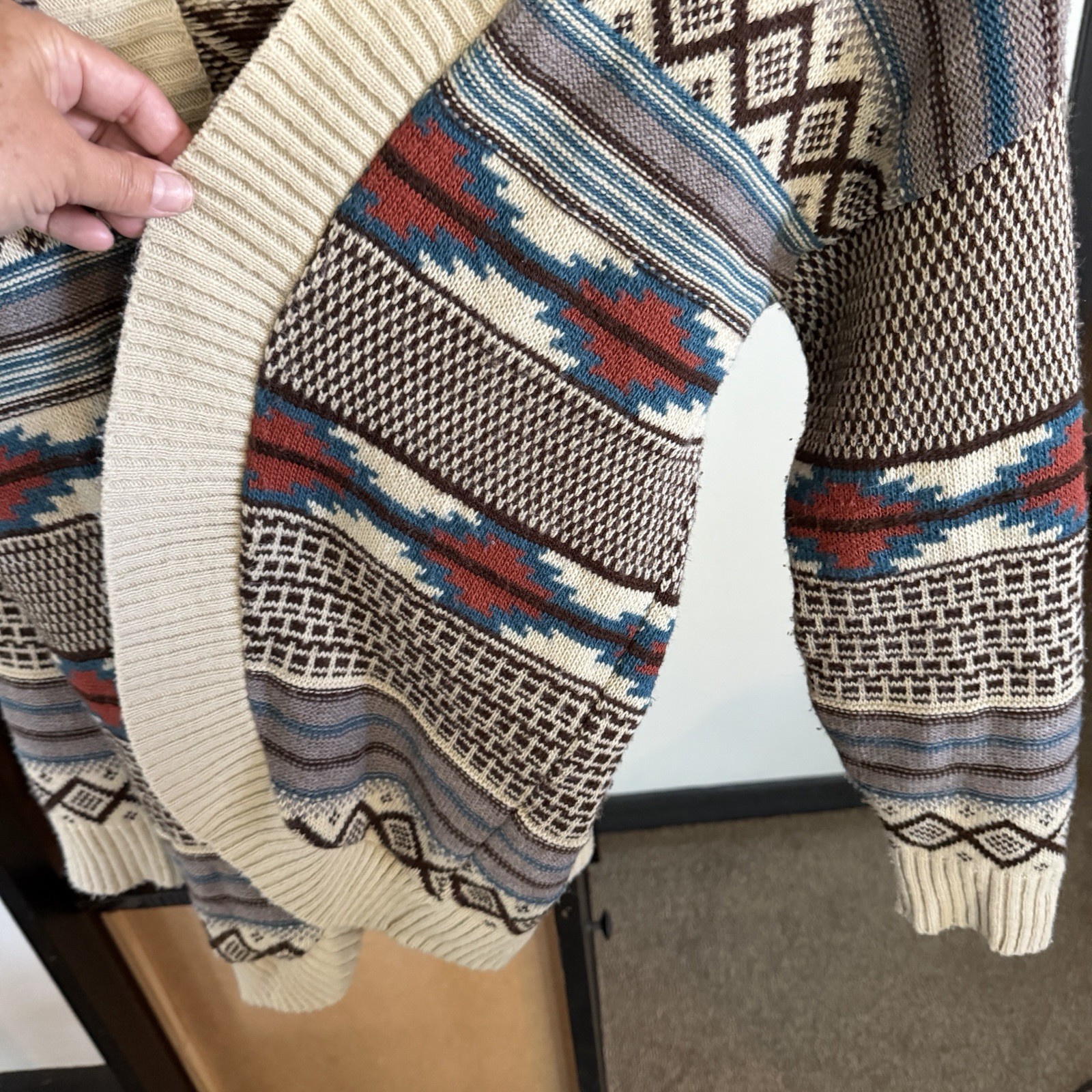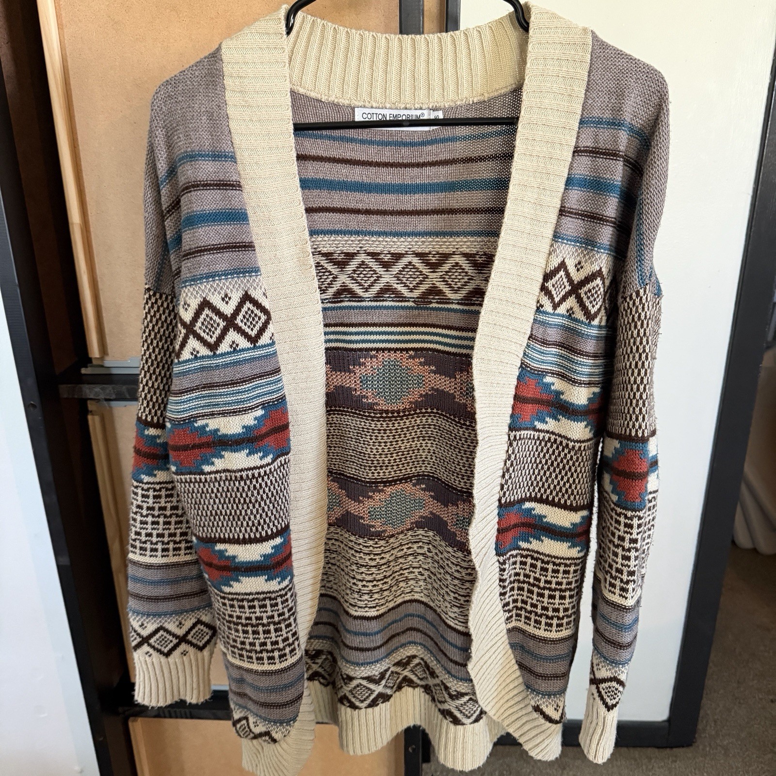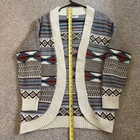 See photos for condition and measurements. Good pre-worn women’s Cotton Emporium Aztec Southwestern Blanket Print Cardigan Sweater in Oversized XS is a stylish and comfortable piece perfect for the winter and fall seasons. This sweater features a unique Aztec pattern in a multicolor design, made from cozy cotton material with a cable-knit style. The relaxed fit and long sleeves make it easy to layer over any outfit, while the machine-washable exterior ensures easy care. Designed by Cotton Emporium in the United States, this cardigan is a must-have for women looking to add a touch of Aztec-inspired flair to their wardrobe.