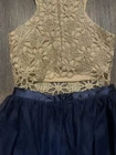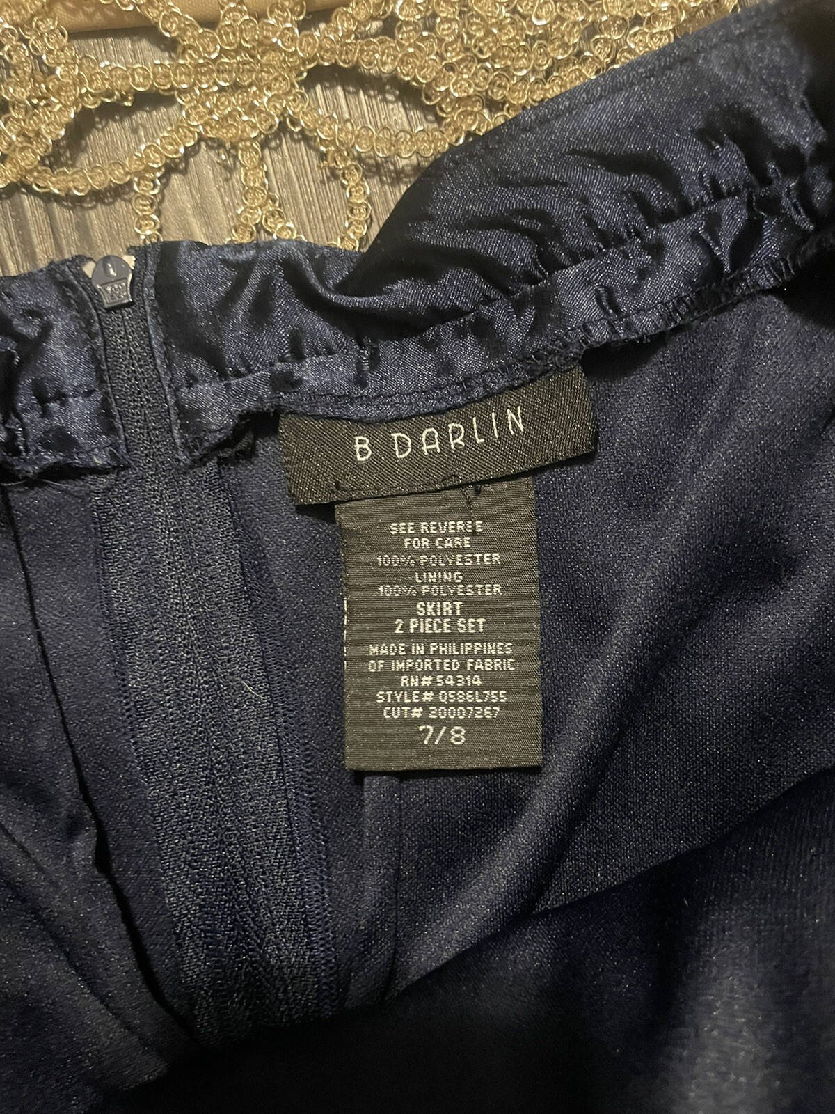 B Darlin 2 Piece Formal Dress gold and navy blue size 7/8 top is 100% polyester has built-in padding full zip bottom is 100% polyester half zip triple lined worn twice