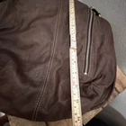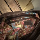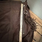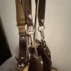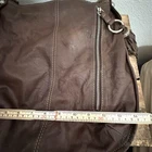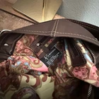 This B. Makowsky shoulder bag is a must-have for any fashion-forward woman. The dark brown leather exterior is paired with two shoulder straps, one is adjustable.The bag features a zip closure and a fabric lining with a multicolor design. The silver hardware adds a touch of elegance to the bag's overall appearance. Please see pictures for item, description, and measurements No rips, no tears in very good used condition. Lining is intact, beautiful colors. Color is a beautiful l unique dark brown with a slight hint of black .