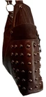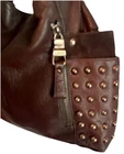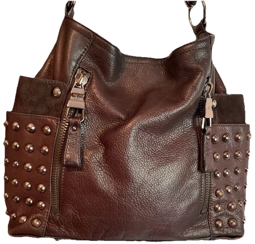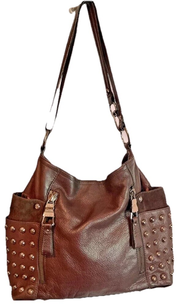 This B Makowsky Leather Shoulder Crossbody Handbag is a medium-sized hobo bag with a square shape and a glossy finish. The exterior is a solid brown color with suede accents and copper studs for added style. It features a zip and magnetic closure, bottom studs for durability, exterior pockets for convenience, and an adjustable crossbody strap with a 24-inch handle drop. The interior is lined with B Makowsky's Cheeta polyester material and includes an interior pocket for organization. Perfect for women who appreciate a stylish and functional handbag for everyday use.