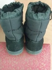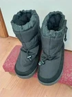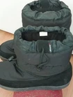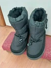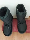 These BAFFIN Unisex XXL Snow Boots in black feature a solid pattern with a round toe shape and a pull-on closure. The boots are made of nylon and leather with a rubber outsole, designed for winter weather. They are insulated, water-resistant, and have an adjustable strap for a secure fit. The model is Campfire S021SH, suitable for both men and women.