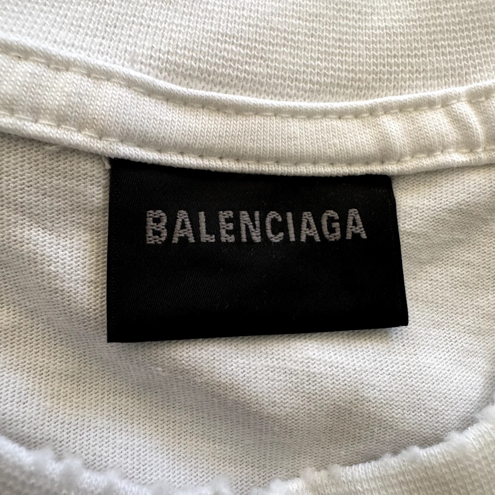 This shirt has only ever been worn once it's in great condition with no stains and still has its clean distressed style along each opening on the shirt. This will be carefully packaged and shipped the same day, The BALENCIAGA Reverse Logo Print White Men's T-Shirt in size LARGE features a solid white color with a crew neckline and short sleeves, made from lightweight cotton fabric. This relaxed fit t-shirt is adorned with the iconic Balenciaga logo as accents, perfect for a summer wardrobe. With its designer theme and oversized design, this t-shirt embodies a sense of adventure and style, making it a statement piece for any fashion-forward man.