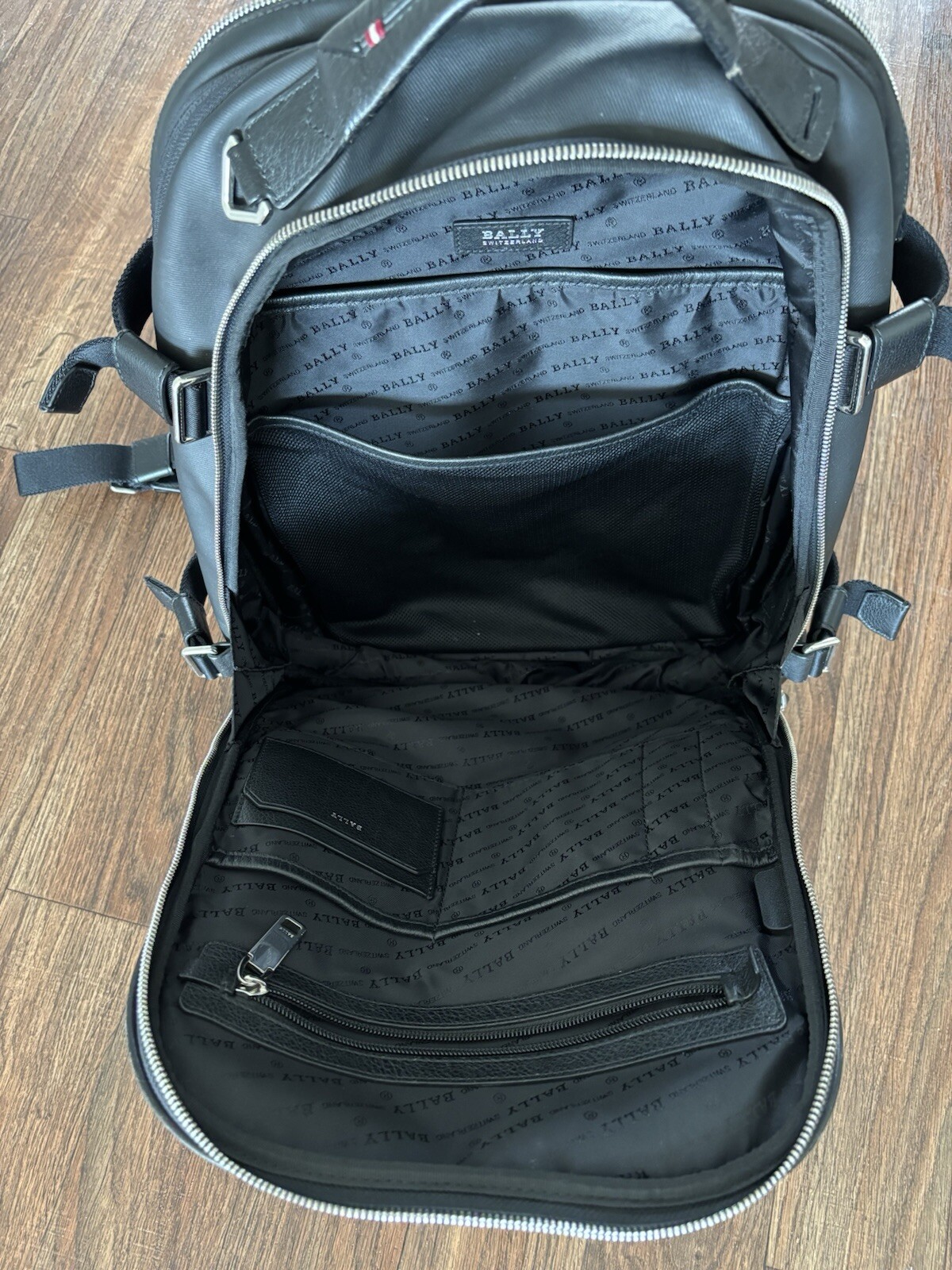 Product Details Part of Bally's Vogel business travel collection, this Veltan backpack is crafted from scratch and water-resistant coated cotton canvas and leather. It features adjustable shoulder straps, multiple internal zipped compartments for your office essentials, a rear zipped pocket for easy access to travel essentials, side straps and a D-ring for additional accessories, as well as a laptop pocket. SKU: 6227992-BLACK Black Fabric Made in: Italy Dimensions: 30cm x 42cm x 16cm Pre owned condition, minimal signs of wear Super clean interior