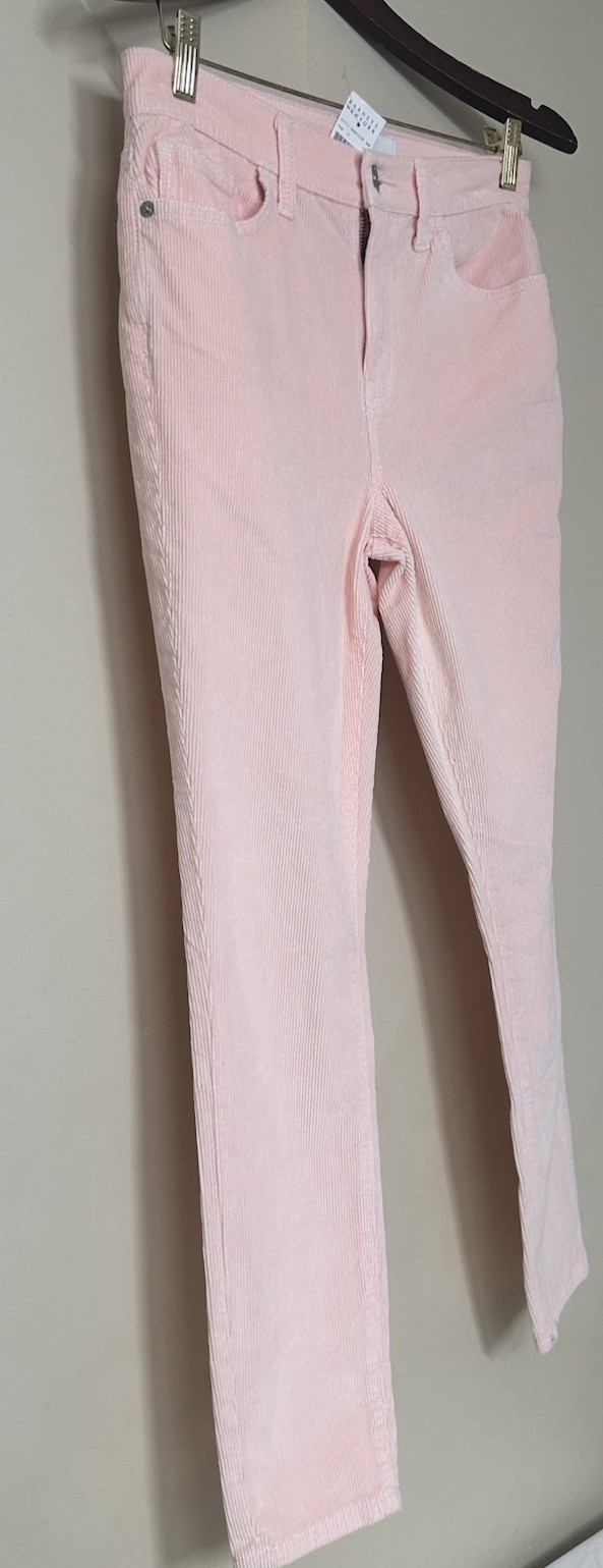 The product is a pair of light pink corduroy pants NWT from the brand Barneys New York in size 27. These slim-fit pants feature a high rise and a skinny leg style, making them stylish for various occasions such as travel, parties, and casual outings. The pants are perfect for the fall and winter seasons, and they have a stretch fabric for added comfort and flexibility. With a zip and button closure, these ankle-length pants are a fashionable addition to any woman's wardrobe.