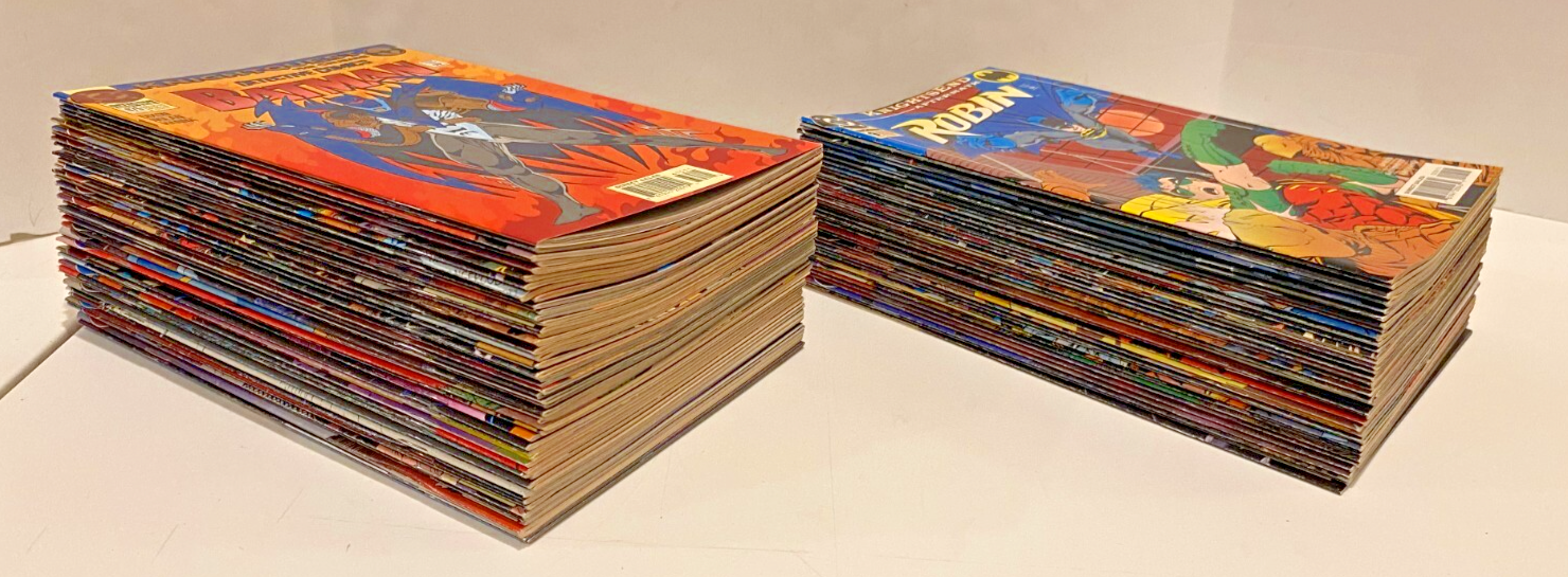 BATMAN "Cross-Over" SERIES 90 BOOK COLLECTION DC COMICS 1993/1995 This set of books was compiled and sold in my old shop back in the day when it was SUPER HOT!!! This set/lot of books has been set aside and stored in boards & bags for 30 years. For this sale I have REPLACED each book with a NEW board & Bag!! They should all be in VF/NM condition, but unless you are with the CGC as a grader, then this is a subjective matter. YOU BE THE JUDGE, see the scans I also added the OVERSTREET grading guides for you to read. From what I saw, almost all books were NM, smooth spines, no stress lines, clean staples, sharp corners almost no edge wear. Out of 90 books there might be a couple with some imperfection somewhere. Just to be safe, let's say they are "just not perfect" THIS SALE INCLUDES: KNIGHTFALL Apr 93 - Oct 93 Prelude BATMAN 491 "Signed w/COA BATMAN 492-500 497 has the flip cover 500 has 2 books, the regular & Glossy Die-Cut Cover copies DETECTIVE COMICS 659-666 SHADOW OF THE BAT 16-18 SHOWCASE93 7-8 KNIGHTQUEST Oct 93 - June 94 THE CRUSADE BATMAN 501-508 DETECTIVE COMICS 667-675 675 has 2 books, the Embossed & Variant covers SHADOW OF THE BAT 19-20, 24-28 CATWOMAN 6-7 THE SEARCH JUSTICE LEAGUE TASK FORCE 5-6 SHADOW OF THE BAT 21-23 LEGENDS OF THE DARK KNIGHT 59-61 ROBIN 7 KNIGHTSEND July 94 - Feb 95 PART 1 THRU 10 BATMAN 509-510 DETECTIVE COMICE 676-677 SHADOW OF THE BAT 29-30 LEGENDS OF THE DARK KNIGHT 62-63 CATWOMAN 12 ROBIN 8 AFTERMATH CATWOMAN 13 ROBIN 9 SHOWCASE94 10 PRODIGAL Nov 94 - Jan 95 PARTS 1 THRU 12 BATMAN 512-514 DETECTIVE COMICS 679-681 SHADOW OF THE BAT 32-34 ROBIN 11-13 TROIKA Feb 95 BATMAN 515 2 books, Black Embossed Cover & Variant SHADOW OF THE BAT 35 Embossed Cover DETECTIVE COMICS 682 Embossed Cover ROBIN 14 Embossed Cover See my store for other comic specials. I also have about 30,000 comics in stock that I just do not have the time to list. They are from the 1970's thru 1990's from the old shop I had back then. COMICMAGE / CCC COLLECTIBLES has been around for 40+ years. Please feel free to ask questions. ..From a smoke free environment. Sadly comic books can not be shipped media rate. These will ship wrapped and padded in a solid box (maybe 2) with insurance & tracking.