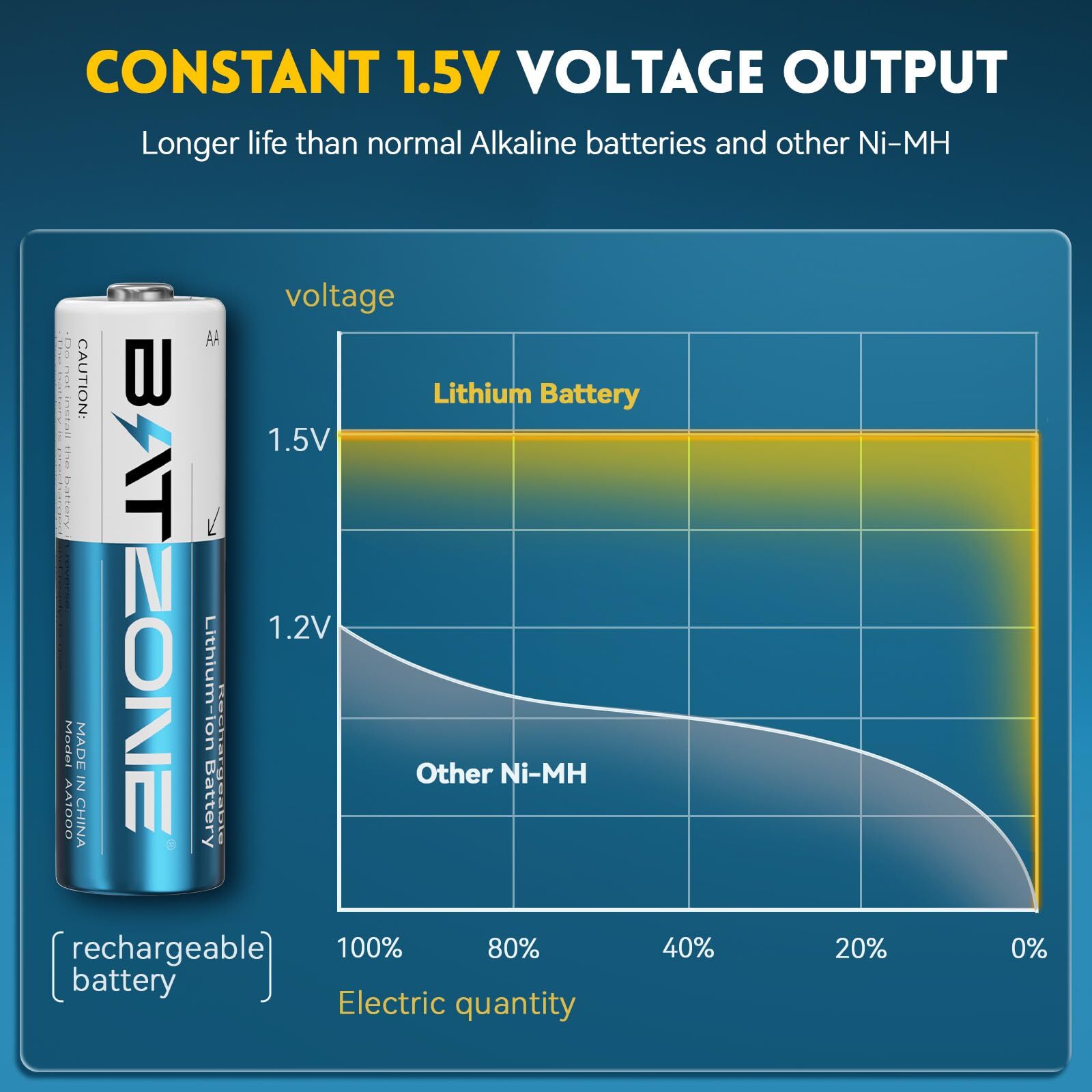 【Ultra-high Capacity and 1.5v Voltage Output】BATZONE rechargeable lithium aa batteries with a high capacity of 3000mWh and higher energy density,which allows for a high number of charge/discharge cycles and a long lifespan.Constant output of 1.5V for the entire process until the power is completely depleted, keeping your device in top condition at all times. 【1600 Times Long Cycle Life】With no memory effect and a very low self-discharge rate, our double a rechargeable lithium batteries have more than 1600 rechargeable cycles, which can save you a lot of money.Overall, rechargeable Lithium AA batteries are a convenient power source,providing a reliable and long-lasting energy supply for everyday use. 【Integrated Charging and Storage】With 8 independent charging slots, the lithium battery charger adopts a magnetic design, allowing the battery charging and storage as one, making the battery storage and carrying more convenient, supporting 1-8 AA lithium batteries in any combination of charging. 【2.5H Fast Charging Technology】2.5 hours quick charge for 1-8pcs aa lithium batteries, reduce your waiting time.Type-C charging port is suitable for all kinds of interface input, you could use a laptop, car charger,power bank,adapters etc. to charge the battery,make the charging more flexible.(Recommended: 5V/3A) 【A Popular Choice for Portable Electronics】BATZONE rechargeable lithium aa batteries with charger feature 3000mWh and 1.5V constant voltage output, ideal for high power consumption devices,such as Gamepad, VR Grip, Doorbell, Camera, Flash, Door Lock, Microphone, Radio, Children's Toys, Alarm Clock, Scale, Blood Pressure Monitor and so on.(Also Suitable for blink camera )