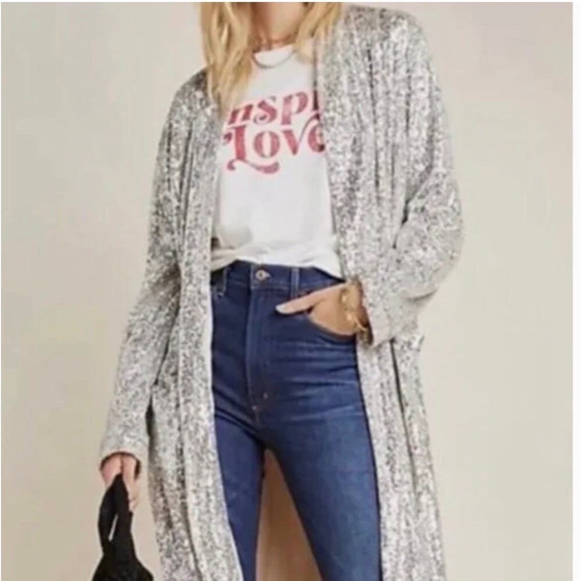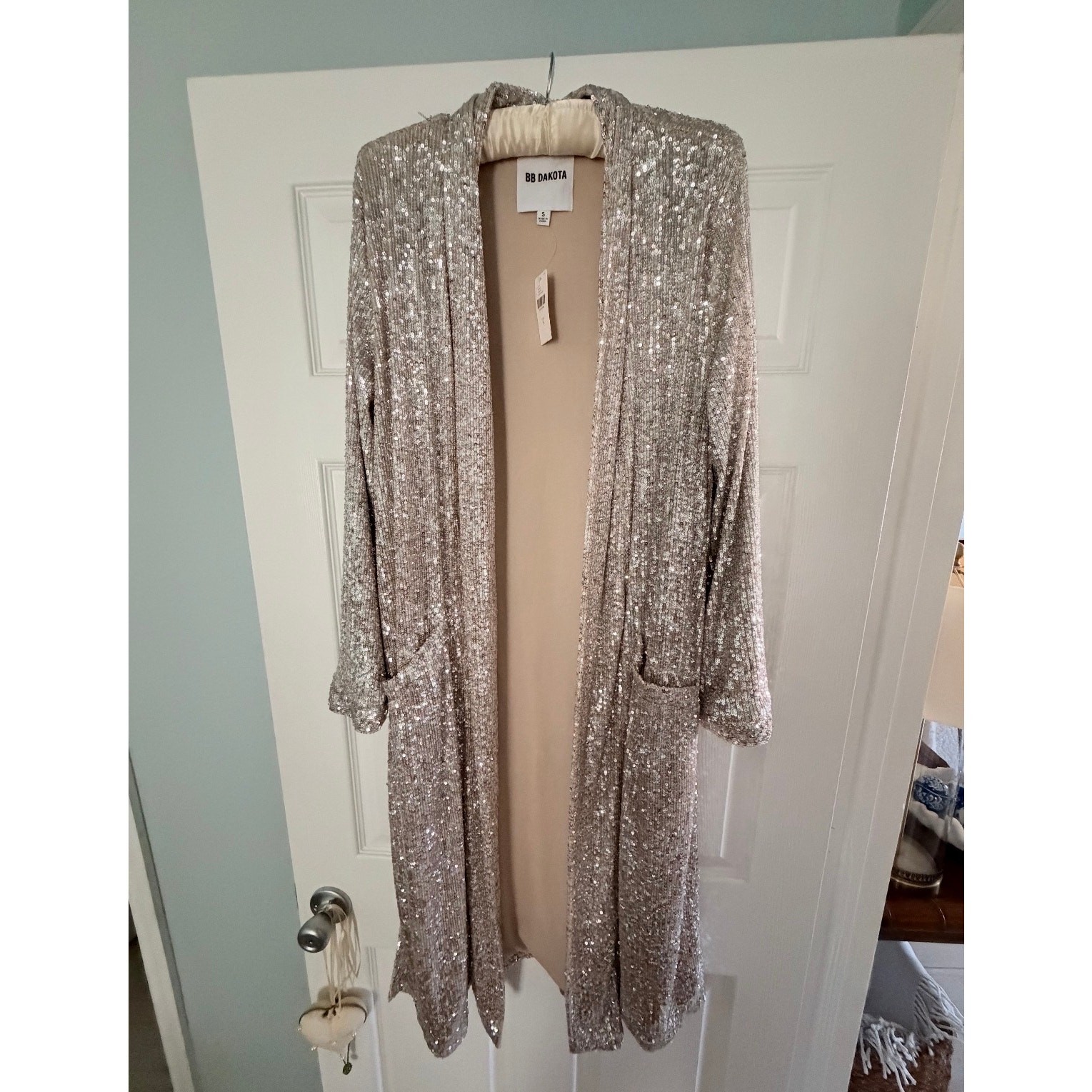 Anthropologie - BB Dakota Open Front Duster Platinum - Size Small NEW with original tags, $148 Retail (never worn) Add a touch of glam to any outfit with this stunning BB Dakota for Anthropologie Dulcinea sequined duster. This statement duster has all over sequins that transform this trendy piece into an occasion-ready staple This platinum-colored duster is brand new with tags and ready to make a statement at your end-of-year party, where it is sure to turn heads! New with tags, never worn Size Small Platinum BB Dakota for Anthropologie Dulcinea Open Front Sequined Duster in Platinum, Size Small, NWT