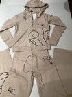Elevate your activewear game with this stylish BCBG Max Azaria tracksuit in a trendy beige color. The set includes a jacket and pants made of comfortable cotton and spandex French Terry fabric, perfect for a workout or casual day out. The hooded sweatsuit features a 90s athleisure theme, making it a must-have addition to your wardrobe. This tracksuit is perfect for women who wear size S and prefer regular size type. Its features include a hood, making it a practical choice for outdoor activities. The BCBGMAXAZRIA brand is known for its quality and style, and this tracksuit is no exception.