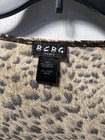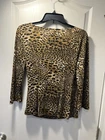 This is a BCBGMAXAZRIA blouse for women in size L with a brown cheetah/leopard animal print pattern. It has a classic/fitted 3/4 sleeve type and a pullover closure. The blouse is made of stretchy polyester material and is machine washable. It is suitable for travel, casual, workwear, and business occasions. The blouse has a basic style and a leopard theme. It is an all-season garment that can be worn in winter, summer, fall, and spring.