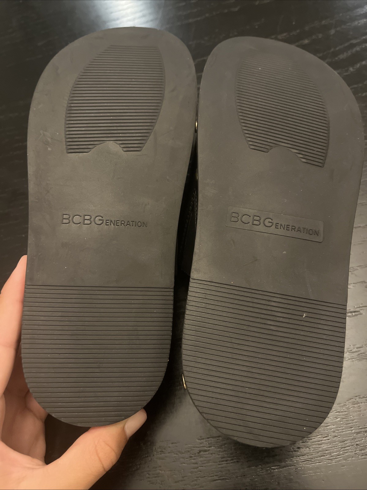 The BCBGeneration Bamba Slip On Studded Slide Platform Sandal in women's size 8 is a stylish and comfortable sandal perfect for casual wear. With a slip-on design and studded accents, this black sandal features a flat heel and platform style for added height. Made of faux leather and designed with memory foam for comfort, this angel-themed sandal is both trendy and practical for everyday wear. The BCBGeneration brand ensures quality and style in this fashionable sandal.