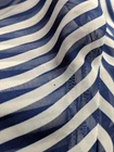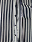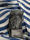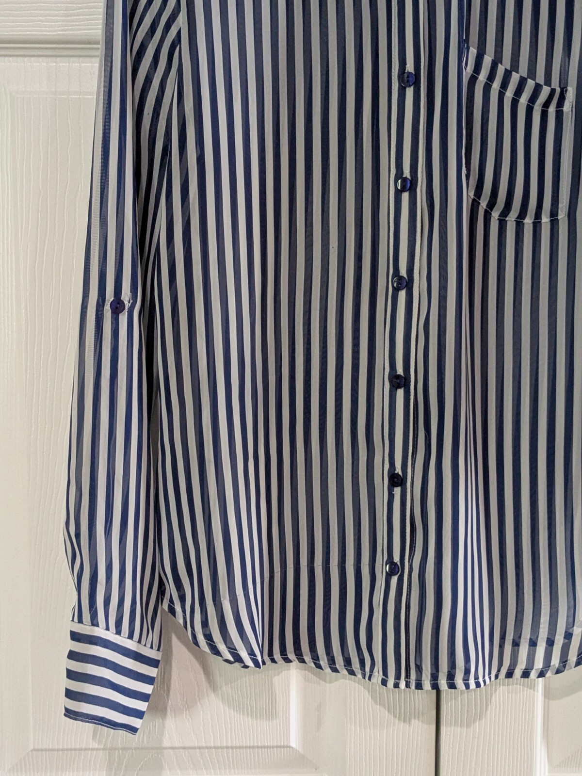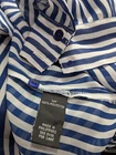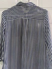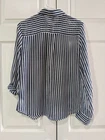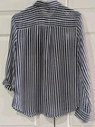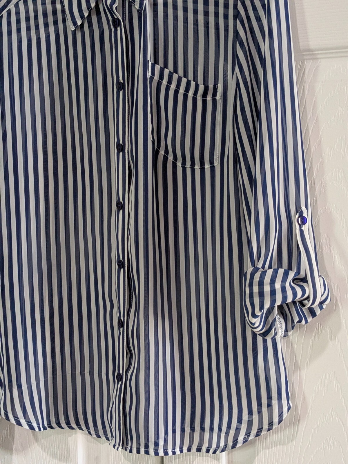 BCX women's sheer collared blouse in blue and white stripes, size medium, featuring long sleeves with buttoned cuffs, button-down front, single chest pocket, shoulder epaulets, and roll-tab sleeves with button straps for adjustable styling (shown in photo with one sleeve rolled). Pre-owned. One cuff button is missing but includes an extra button inside, and a snag on the bottom front right, both visible in photos. Made of 100% polyester, machine washable. Measures approximately 18.5" armpit to armpit, 25" from center back of neck to hem, and 24" sleeve from shoulder seam to cuff. CB Treasures ships same day / next day! All items are stored in a clean, smoke-free, and dog-free environment and are carefully packed to guarantee their safe arrival to you. With pre-owned clothing, sizes may vary due to alterations, brand differences, and previous care, so please refer to the provided measurements along with the size tag to ensure the best fit.