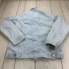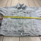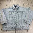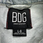 This is a BDG Trucker Denim Jacket for women in size L. It features an acid wash design and oversized, relaxed fit. The jacket is made of 100% cotton with a button closure and long sleeves. The style is a basic jacket with a hipster/grunge theme, suitable for all seasons and occasions like travel and casual wear. The color is blue, and the lining material is also 100% cotton.