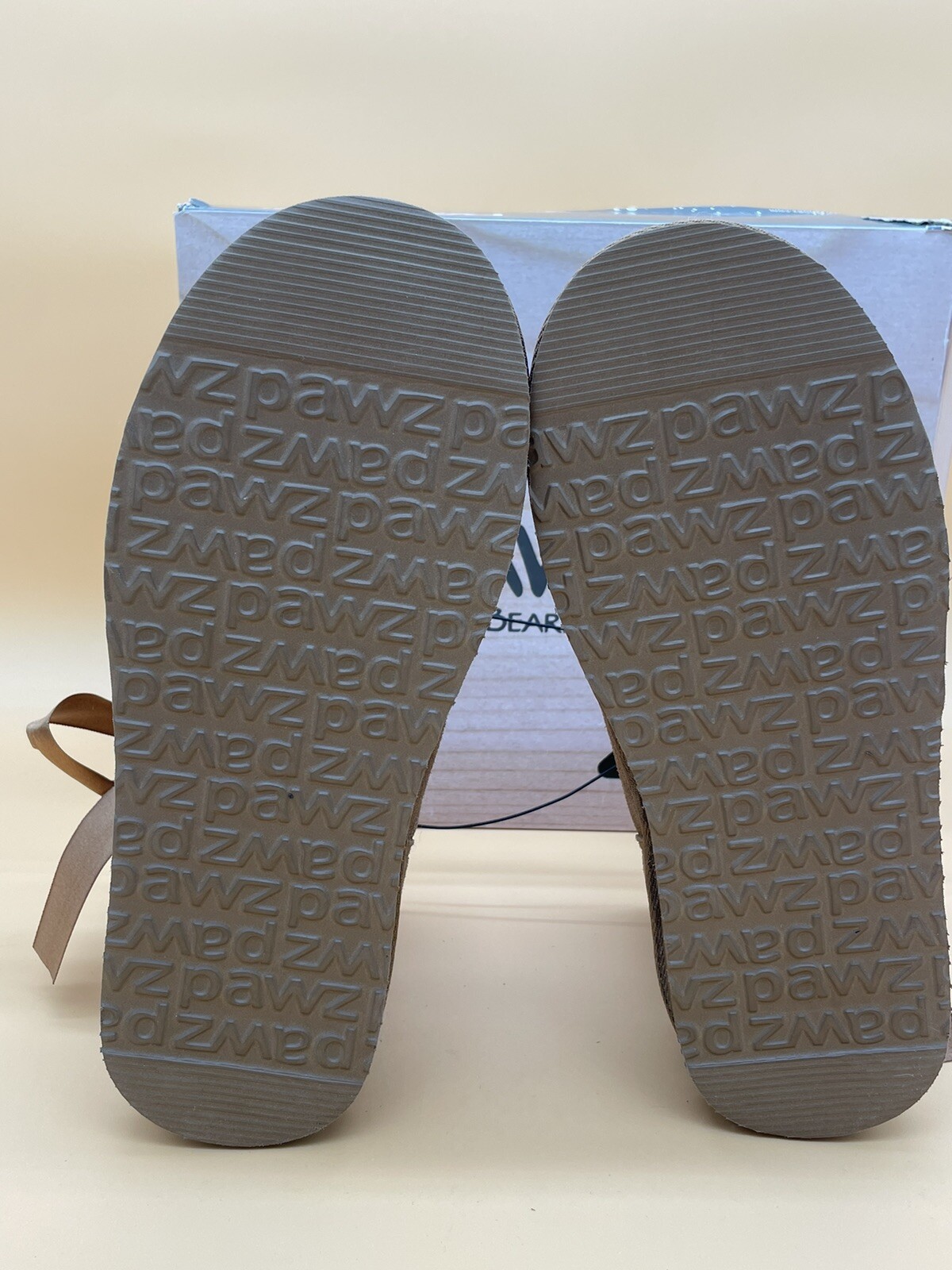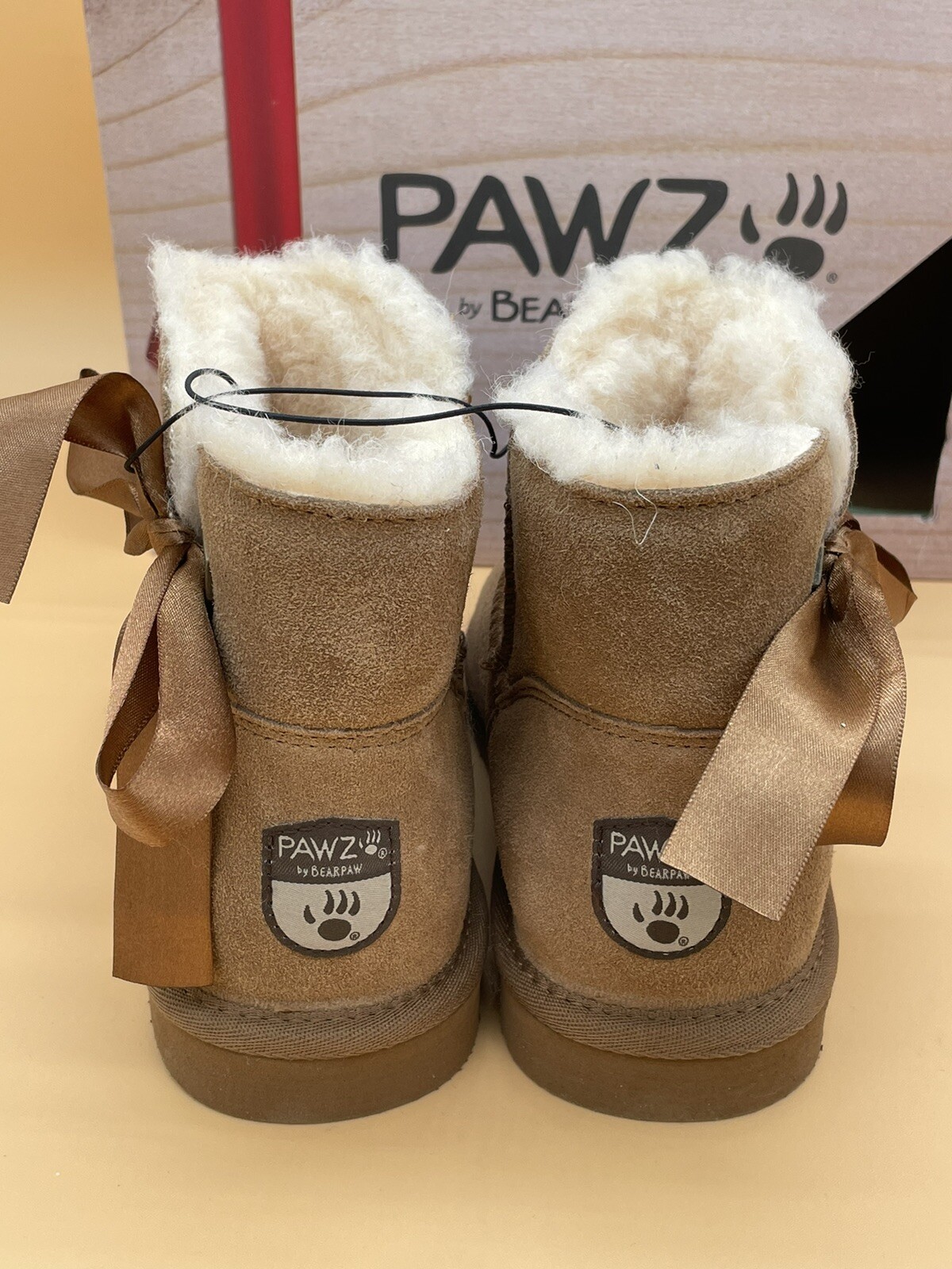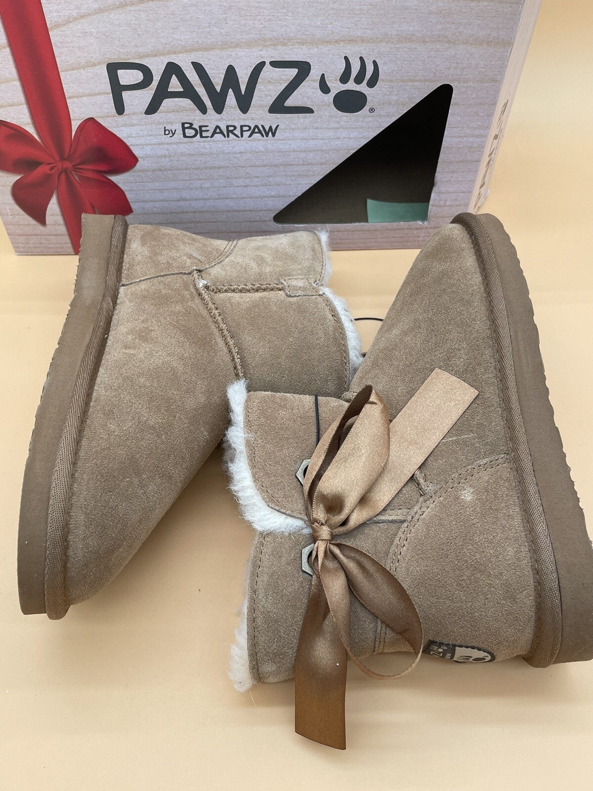 This is a pair of size 7 Pawz Amelia ankle boots by BEARPAW in a hickory suede color. These casual slip-on booties feature a round toe shape, a flat heel under 1 inch, and a cozy faux fur lining. The brushed leather fabric is water-resistant, making them suitable for winter and fall seasons. Additionally, the boots are accented with a bow detail and have a rubber outsole for traction. Perfect for outdoor-themed occasions, these stylish and comfortable Bearpaw boots come in their Christmas box for gifting or personal use.