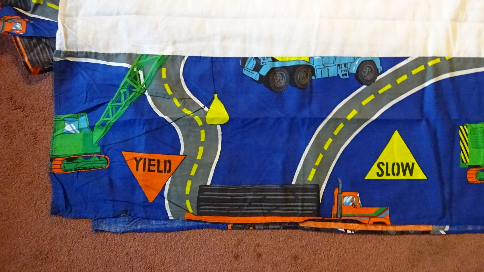 Bed Skirt Unbranded Twin bed size Construction Equipment Theme The bedskirt is not in a package Cotton blend fabric Roads, cranes, tractors, cranes, semi-trucks on dark blue background The platform - the portion that lays under the mattress measures 38" wide by 76" long The skirt portion is 12 1/2" long and has split corners. See photos for more detail. Be sure to see all the images. Be sure to check out our other listings. Thanks for looking and please keep us as one of your favorites -- we have new items often. Please see our other items !