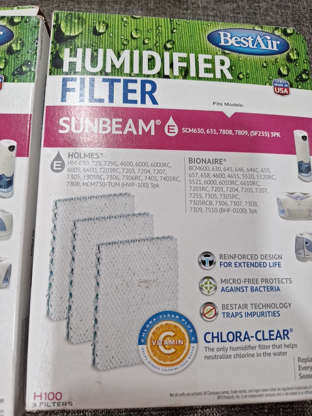 The BestAir Pro Sunbeam Humidifier Filter E 3 Pack Lot of 2 is a set of high-quality filters designed for humidifiers. These filters are flat panel style with a 3-inch diameter and are mesh media for efficient filtration. They are humidity resistant and compatible with a universal range of humidifiers, ensuring clean and healthy air circulation in any home. This pack of filters provides an affordable and reliable solution for maintaining optimal indoor air quality.
