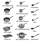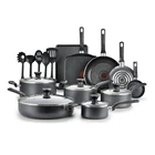 Product details Cooking and cleaning made easy with T-fal Easy Care Nonstick 20-Piece Set, ensuring reliable results when preparing meals for the whole family. Includes 4.5" One Egg Wonder, 8" fry pan with pouring spouts, 10.5" fry pan with pouring spouts, 10.25" griddle, 5QT jumbo cooker with glass lid, 1QT saucepan with glass lid, 2QT saucepan with glass lid, 3QT saucepan with glass lid, 5QT stewpot with glass lid, baking tray, pasta spatula, spatula, ladle, spoon, and slotted spoon. Pro-Glide non-stick interior ensures easy food release, and enables healthy cooking with little to no oil. Thermo-Spot heat indicator shows when T-fal pans are perfectly preheated to start cooking, and the even heat base allows for no hot spots. Features comfortable handles and vented tempered glass lids. Dishwasher and oven safe up to 350°F; all cook tops compatibility excluding Induction; limited lifetime warranty. Proglide Nonstick Interior: Easy release and cleanup Thermo-Spot Technology: Turns solid red to indicate when the pan is properly preheated Comfortable Handle: Sturdy and secure grip Measuring Marks: No need for a measuring cup Vented Glass Lid: Maintain visibility while trapping heat and moisture Dishwasher and Oven Safe: Up to 350°F All Cooktops Compatibility: Excluding Induction LIMITED LIFETIME WARRANTY This 20 Pcs PTFE Non-Stick Cookware Set includes 4.7" Frypan, 8" Frypan, 10.5" Frypan, 1QT Saucepan with lid, 2QT Saucepan with lid, 3QT Sautepan with lid, 5QT Jumbo Cooker with lid, 5QT Stewpot with lid, 10.25" Square Griddle, 13" x 9" Baking Tray, 5 tools Brand T-fal Collection Easy Care Nonstick Piece Count 20 Material Aluminum Pan Material Nonstick Handle Finish Plastic Items Included 4.5" One Egg Wonder, 8" fry pan with pouring spouts, 10.5" fry pan with pouring spouts, 10.25" griddle, 5QT jumbo cooker with glass lid, 1QT saucepan with glass lid, 2QT saucepan with glass lid, 3QT saucepan with glass lid, 5QT stewpot with glass lid, baking tray, pasta spatula, spatula, ladle, spoon, and slotted spoon Color Gray Nonstick Y Features Nonstick, Oven Safe Cleaning, Care & Maintenance Dishwasher safe Manufacturer Groupe SEB Manufacturer Part Number B087SKDW Model B087SKDW Assembled Product Dimensions (L x W x H) 25.20 x 12.60 x 15.94 Inches