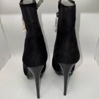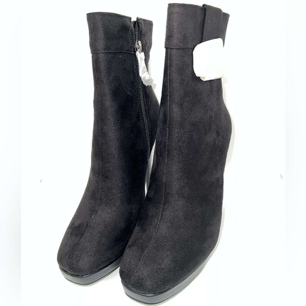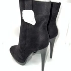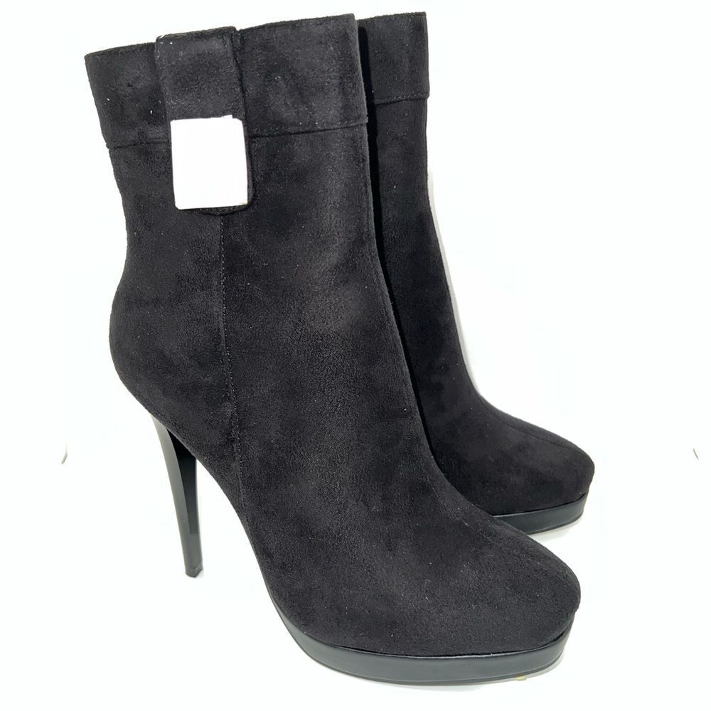 BETSY Black Suede Stiletto Heels Booties Size 8 New With Box. This out and pair of very sexy booties, they are black color, They are mid calf length. The front is round toe, and with 1” platform, has fastening zipper on side, and stilettos heels 5” high Eur size 38 US Women's size 8.
