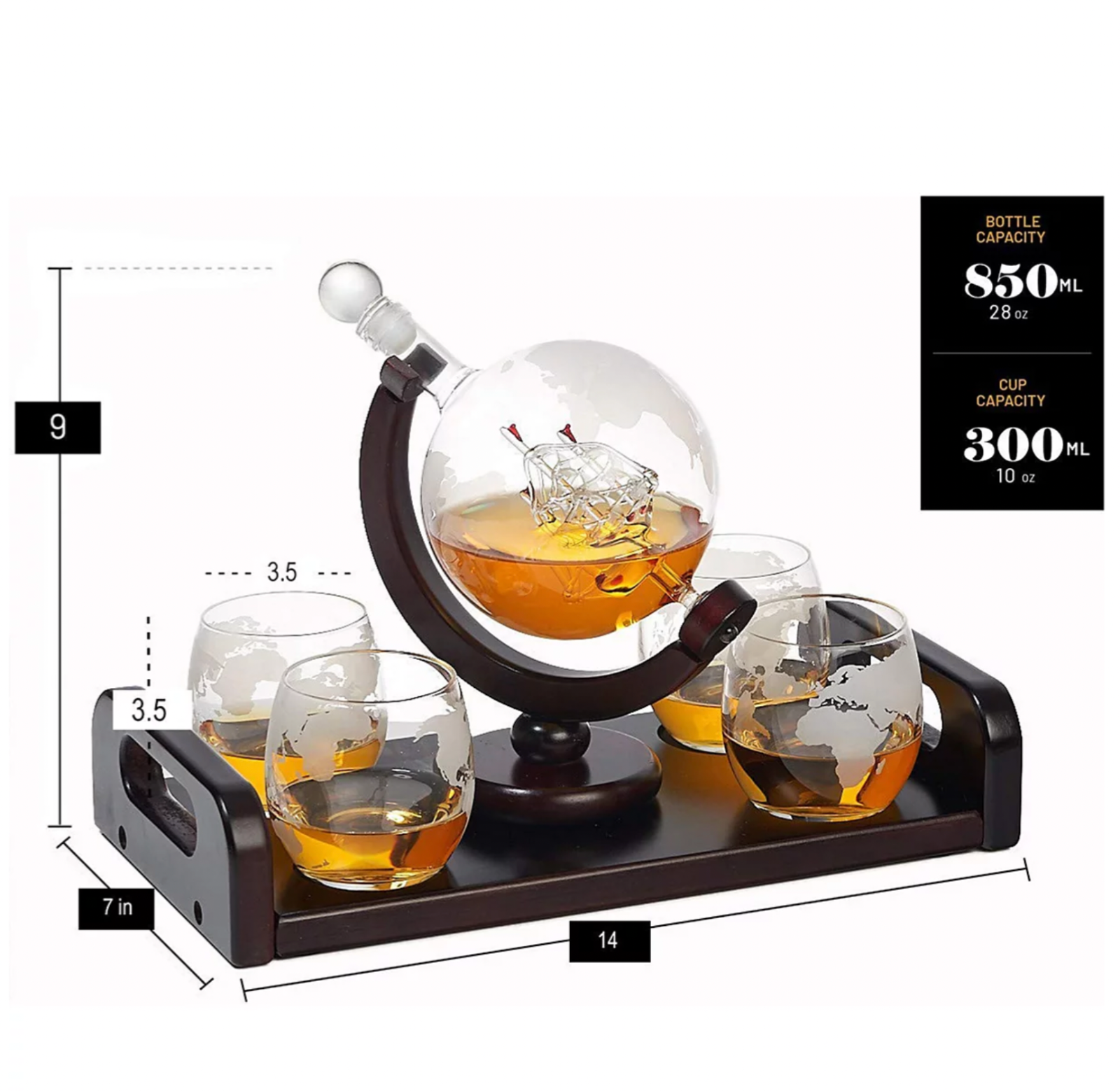 RACCOON VISION WELCOMES YOU! 100% Money Back Guarantee! Bezrat Whisky Cold Drink Crystal Glass Set of 6, 4 Glasses, Decanter and Tray Gift Set MSRP: $205 Model: BT931C SET OF 4 glasses, Decanter + Wood Tray Condition: New in Box. Bezrat etched globe whiskey decanter and whiskey glasses. On wood mahogany base tray - Christmas holiday gift packaging - retro ship whiskey dispenser for liquor scotch bourbon vodka Tray dimensions - 14 " L x 7" W x 9" H Glasses dimensions - 3.5" H x 3.5" D Decanter dimensions (with stand) - 5" W x 8" H Product weight - 2 lbs Decanter capacity - 850 ml (28 oz) Each glass capacity - 300 ml (10 oz) Set includes - 1 whisky decanter, 4 whisky glass and 1 tray Rectangle shaped tray with handles further sophisticates this amazing exquisite decanter adding a breathtaking air to the setup, masterly cut on rich wooden mahogany base which completes its polished look Celebrate with a sophisticated gift the perfect way to acknowledge a family member's special triumphs, celebrate a birthday, praise a work well done, reward a goal achieved 100 percentage lead-free hand-blown glass situated inside is an retro little ship with intricate detail, included is a funnel, airtight stopper to seal the spirits rich flavored detail inside Enhance your home bar with this unique complete elegant whisky decanter set, includes an etched globe decanter accompanied by four matching glasses masterly arranged on a classic mahogany wooden tray Glasses, Decanter - Glass, T ray - Mahogany Wood Hand Wash All items are packaged carefully for shipping to prevent any damage during transportation. International Buyers - Please Note: Import duties, taxes, and charges are not included in the item price or shipping cost. These charges are the buyer's responsibility. Please check with your country's customs office to determine what these additional costs will be prior to bidding or buying. If you have any questions please feel free to ask. Thank you for choosing us! Item ID: RVM T_209