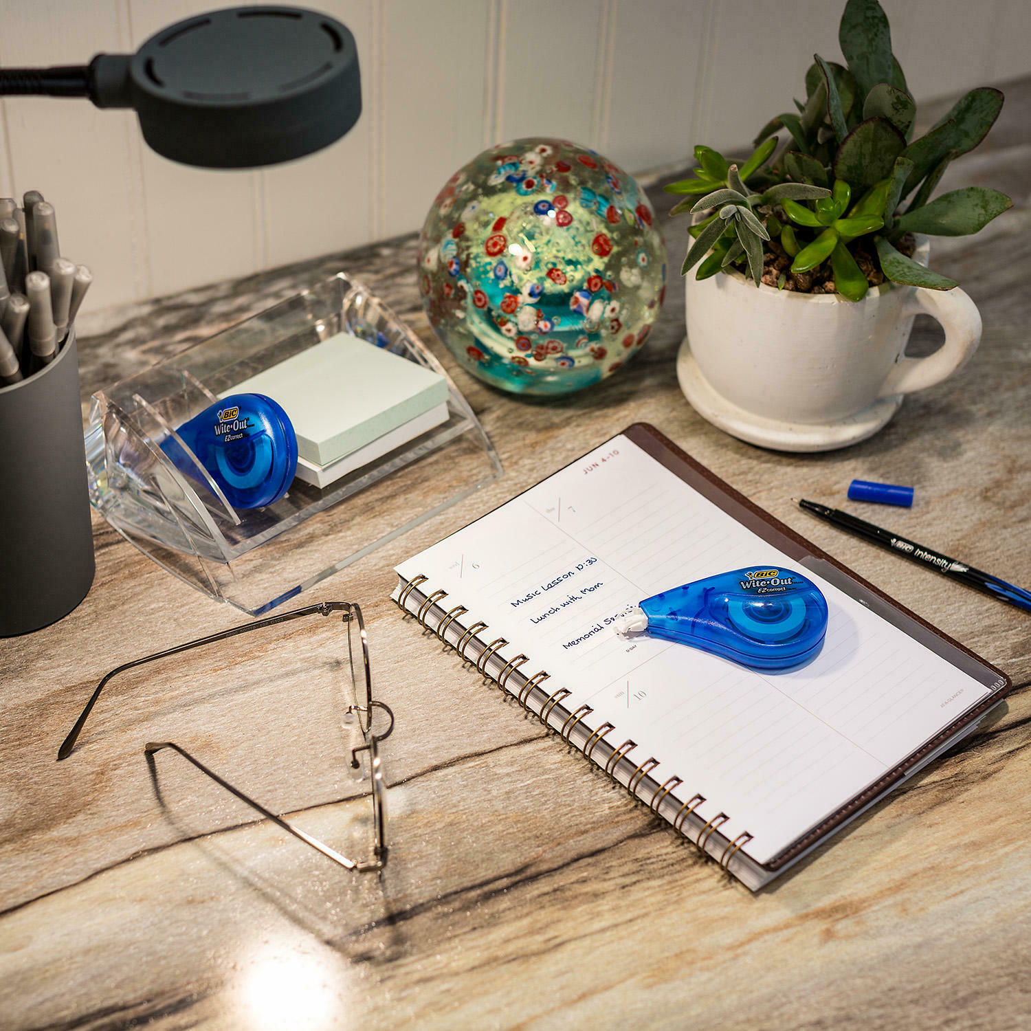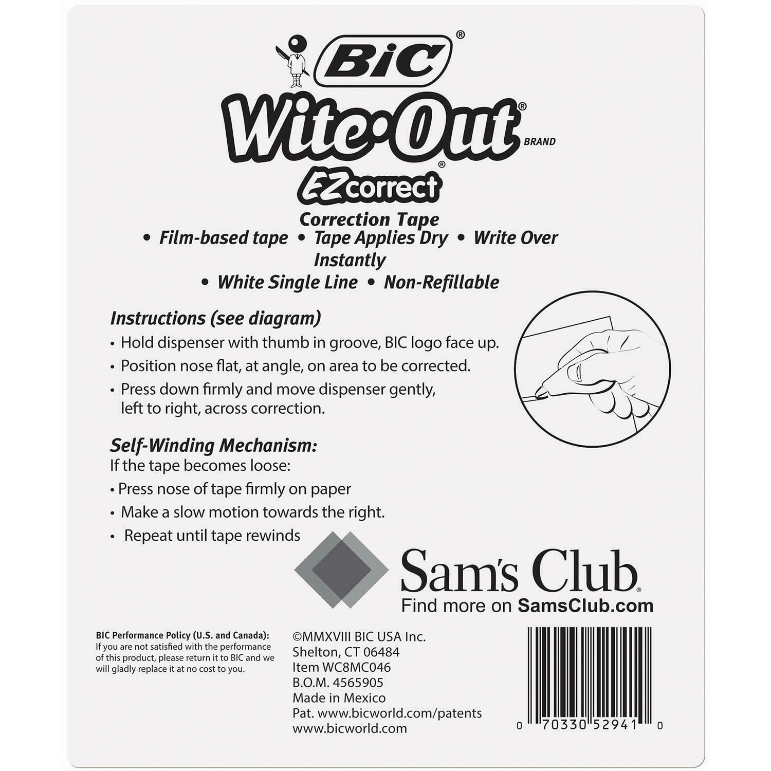 BIC Wite-Out Brand EZ Correct Correction Tape, White, 6 Count About this item Pack includes 6 dispensers of white correction tape Tape applies dry Applies in a neat, single white line for easy corrections Compact Description Quickly and easily correct typed or handwritten errors on your documents with BIC® Wite-Out Brand EZ Correct Correction Tape (6 ct.). Made by America's #1 Correction Brand, this white correction tape goes on dry so that you can make instant corrections with no mess and no more waiting time. Specifications Strong correction tape made by America's #1 Correction Brand* Tape applies dry so you can instantly write or type over Film-based tape offers more strength than paper-based tape Applies in a neat, single white line Compact dispenser is easy to take anywhere Translucent body lets you see how much tape remains Each dispenser contains 39.3 feet of correction tape The self-winding mechanism helps you rewind the loose tape Pack includes six dispensers of white correction tape Includes 234 ft of tape