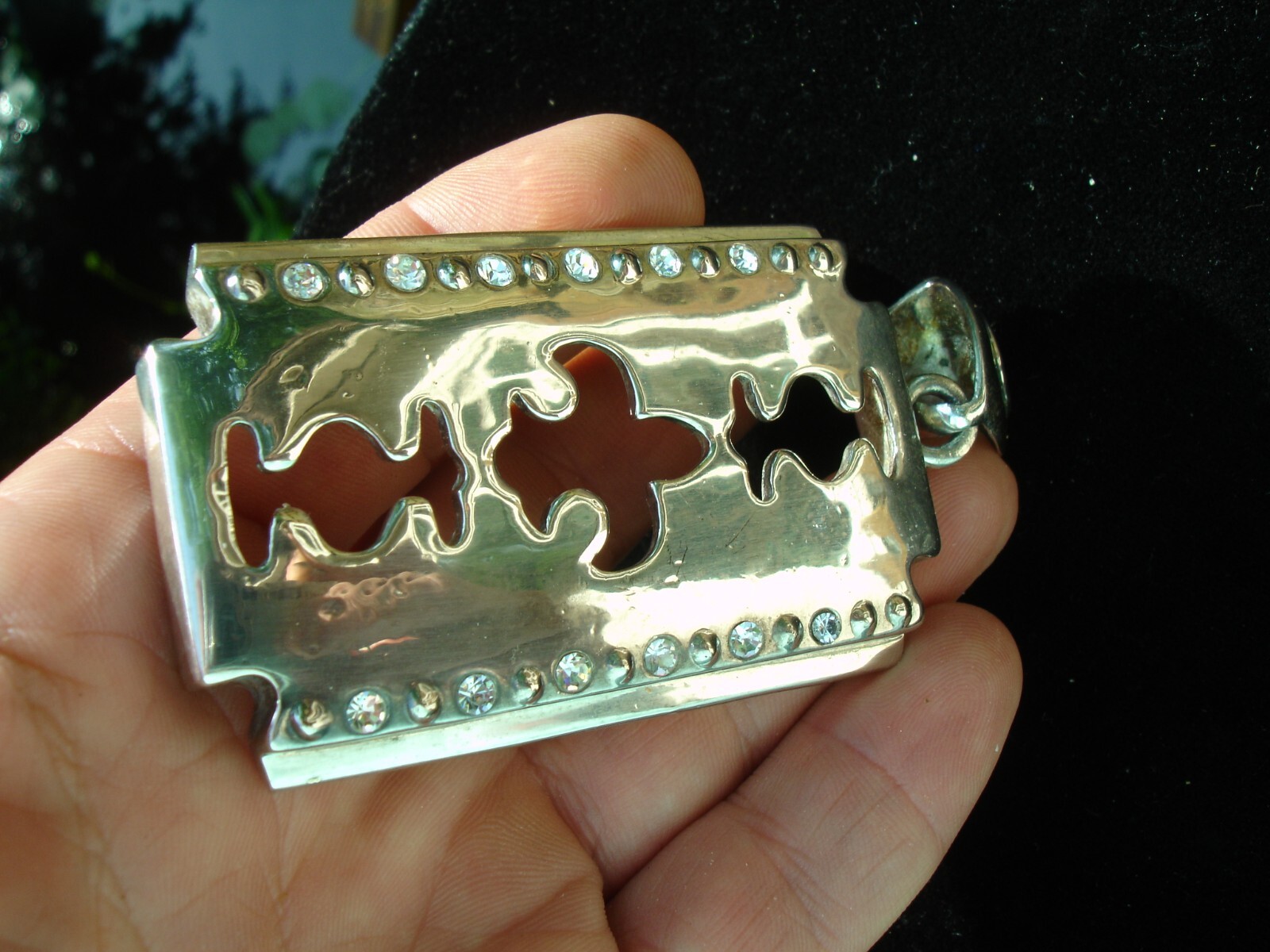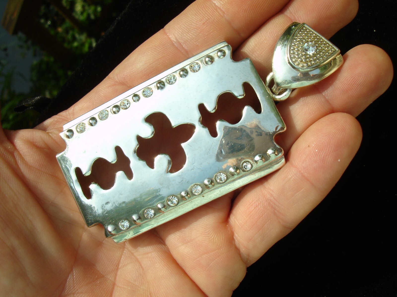 NEW from vintage stock (never been worn)... about 12 rhinestones dazzle the eyes + one more on the bail itself... Nice sized pendant/charm measuring about 3.75" top to bottom (including the bail) by about 1.75" wide. Please include $3.95 domestic s hipping... (Worldwide International shipping please include $16.95 s/h). Thanks for stopping in... "For God so loved the world that He gave his one and only Son, that whoever believes in him, shall not perish but have eternal life" Jesus (John chapter 3)