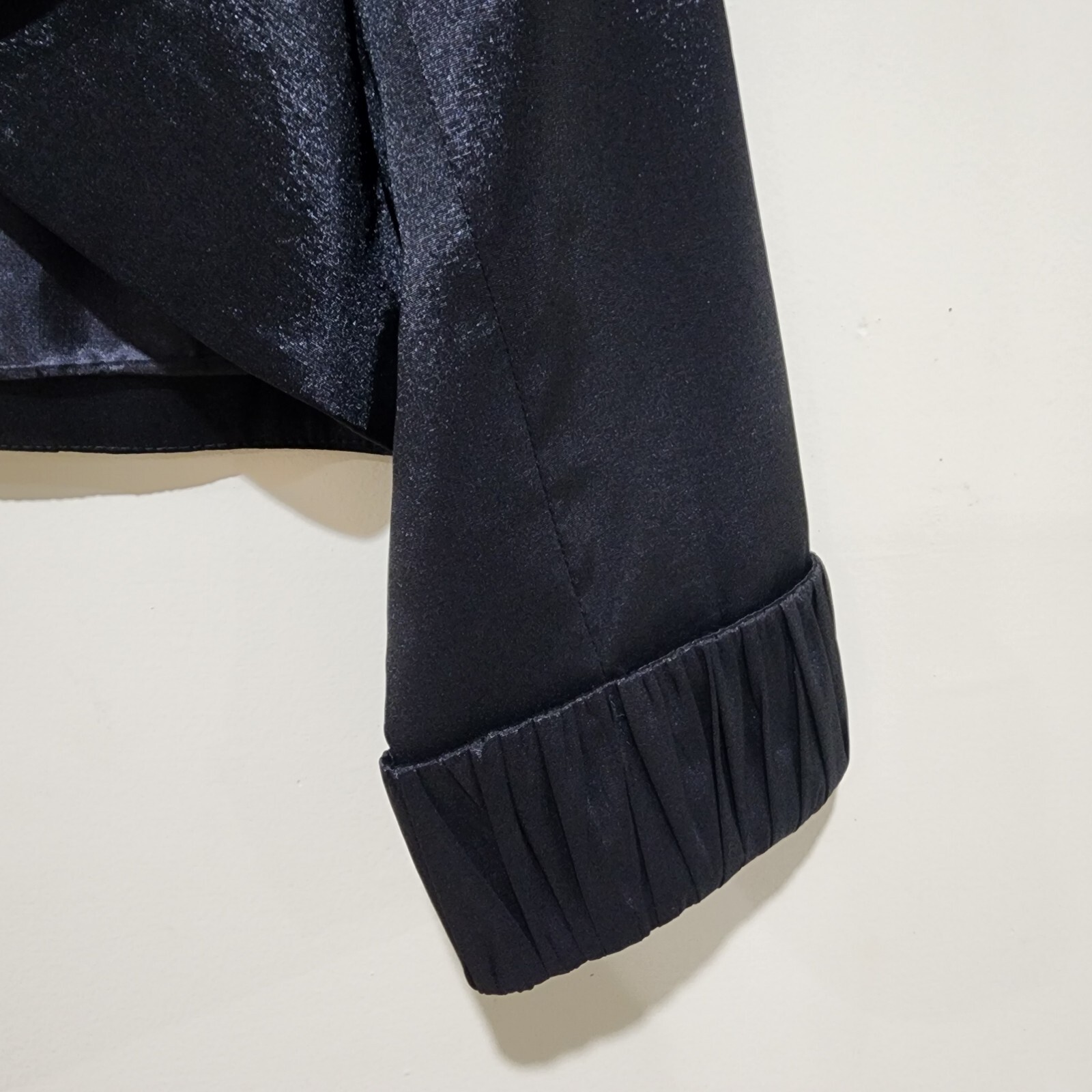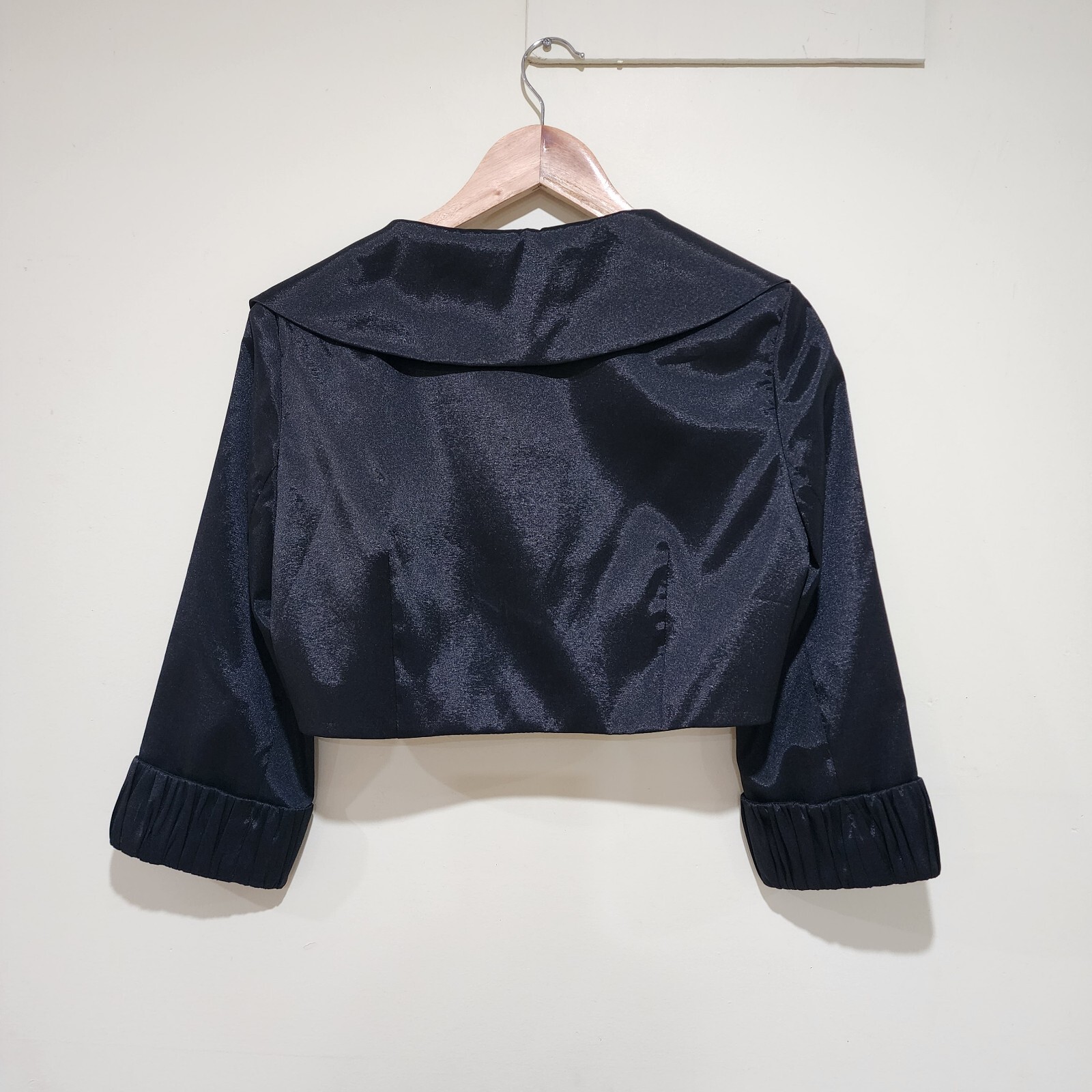 Bolero Size 10 B-J-C vintage bolero This bolero features adorable puff cuffs and a cute collar Size: 10 Condition: Brand new with tags Material: Polyester and spandex blend Features: Open style, 3/4 length sleeves, puff cuffs, cute collar, lovely sheen finish Colour: Shimmery Black Perfect for adding a vintage flair to your outfit, a bolero is a must-have to dress up a pair of jeans or add a but of glam to anything you want to wear. #VintageBolero #BJCBolero #FormalJacket #ShortJacket #BlackBolero