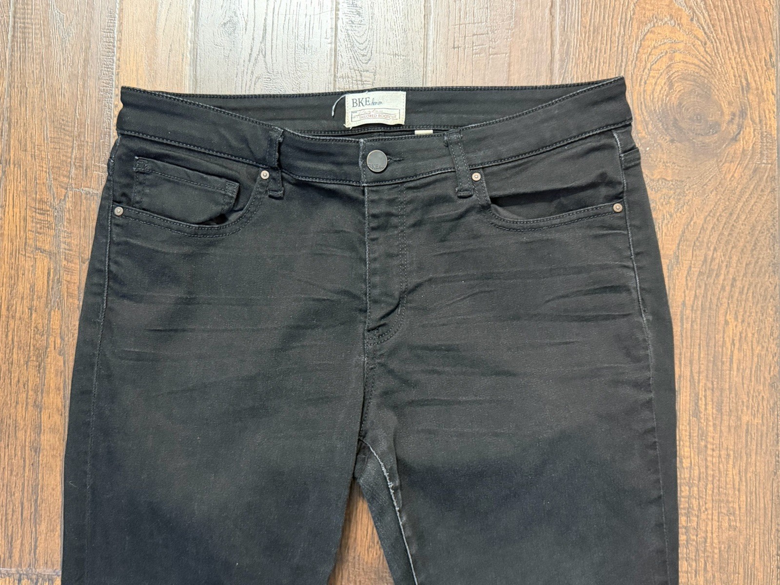 The BKE Denim Payton Tailored Bootcut Jeans in women's size 34x31 by Buckle Black are a stylish and versatile addition to any wardrobe. Made from a blend of polyester, spandex, lyocell, and cotton, these jeans feature a bootcut style, 5-pocket design, and stretch fabric for added comfort. The dark wash and solid black color make them a classic choice for year-round wear, while the accents of branded buttons and logos add a touch of personality. With a regular fit and machine washable care instructions, these jeans are perfect for everyday wear.