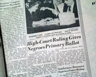 BLACKS VOTING RIGHTS Smith v. Allwright Desegregation Decision 1944 Newspaper Offered is an original, collectible newspaper (NOT a copy/reproduction): THE DETROIT FREE PRESS, April 4, 1944 * Smith v. Allwright decision (1st report) * United States Supreme Court decision * African Americans voting rights in Texas Page 3 has a two column heading: "High-Court Ruling Gives Negroes Primary Ballot" with smaller subheads. (see images) Complete with 16 pages, light toning and a little wear at the margins, generally nice. Please Note: All of our offerings are 100% authentic! We do not offer reprints or reproductions of any kind. They are guaranteed to be original! Links to Archival Storage Options & Certificates of Authenticity Are Below! Historical reports may be beautiful or ugly, but they are always informative. While we rejoice in the beautiful (heroic, discovery, amazing feats, etc.), we at History's Newsstand also offer "the ugly" for we are determined to learn from the wrongs of the past - understanding, to do so, we must be willing to look these wrongs directly in the face and shout "NO MORE!". It is for this reason many Black Americans collect historic slave ads, Jews collect reports regarding the Holocaust, women collect coverage of the Women's Suffrage Movement, etc.. If you find any to be offensive, we agree! Hopefully this is an indication we are moving in the right direction. Domestic Shipping Policy... For this specific item, A U.S. winner pays $10.00 S&H. If multiple items are purchased and paid for simultaneously , the S&H will be calculated by using the highest item's S&H as the base cost , and then adding a small amount for each additional newspaper. The per-item additional cost for newspapers, folders, portfolios, and presentation cases vary according to size and weight. All U.S. orders include in-house insurance at no additional cost to the buyer and include delivery confirmation. All orders include tracking & delivery confirmation. Orders ship within 24 business hours of receiving payment. Some small items may be shipped 1st Class. We will still provide tracking and insure them at our expense. Combined Shipping Notice If the automated eBay checkout process does not properly combine shipping, we will refund overages automatically. If you prefer, contact us prior to payment to obtain a revised invoice. International Shipping Policy... If the S&H to your location is not given, international buyers/winners should contact us for an invoice which includes S&H . Import duties, taxes, VAT. etc. are not included in our quoted S&H. These charges are the buyer’s responsibility. Note: We will not falsify customs declarations or mark an item as a "gift" in order to avoid customs fees. If insurance is desired, be in touch for a quote. All insured orders are subject to customs, duties, & taxes for the amount insured and are the buyer's responsibility. International purchasers are encouraged to take advantage of our combined shipping policy to lower the cost per item S&H. If you wish to take advantage of combined shipping, please do not pay for any until you are finished - and then contact us for a combined invoice. If You Are Unhappy With Your Order We make every effort to provide the best possible buying experience. If we fall short of your expectations in any way, please contact us so we can try to make things right for you. Archival Storage... ...is available for an additional $15.00, plus an appropriate adjustment to S&H (see above Shipping Policy). If desired, purchase this directly (through eBay) at: archival storage folder . Again, to insure you will receive the appropriately sized folder for your item, please select the $15.00 folder option. Certificate of Authenticity... A certificate of authenticity is also available for an additional $3.00, which includes both the issue date and title, and certifies, by Timothy Hughes Rare & Early Newspapers, the issue to be authentic & original. If desired, purchase this directly (through eBay) at: certificate of authenticity . About Us... Contact Information... We have been both collectors and dealers in rare newspapers since 1975, serve as consultants to multiple museums, and are members of both the Ephemera Society of America and the American Antiquarian Society. Bid & Buy with confidence knowing every item we offer is guaranteed to be authentic. Timothy Hughes Rare Newspapers P.O. Box 3636 Williamsport, PA 17701-8636 Hours: M-F, 7:30-4:00 EST View our additional ebay offerings "...desiring to conduct ourselves honorably in all things." Heb. 13:18 In an effort to honor eBay's policies and our loyal customers who watch our listings, we do not end auction items early. We hope you understand! " Were it left to me to decide whether we should have a government without newspapers, or newspapers without a government, I should not hesitate a moment to prefer the latter." Thomas Jefferson