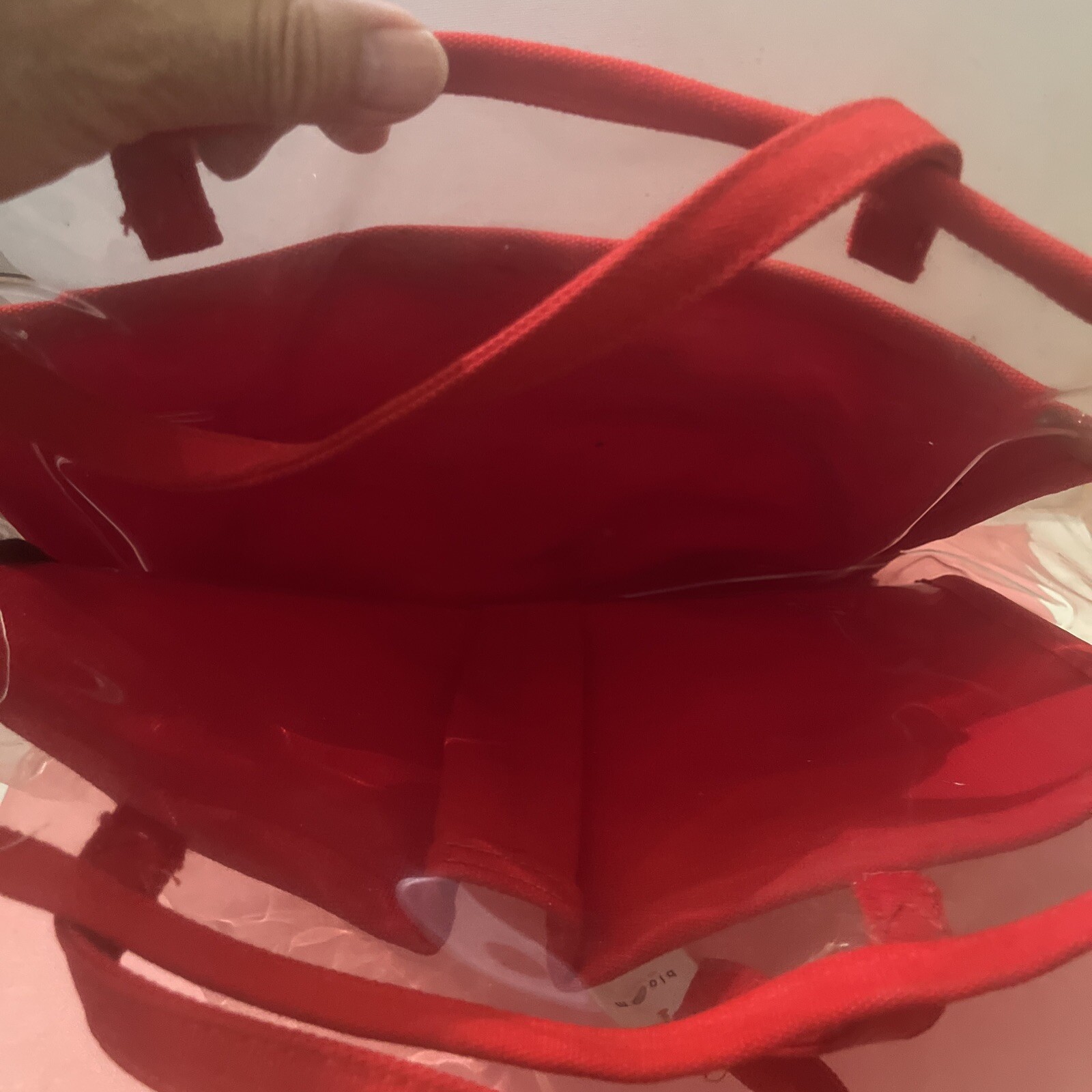 New Bloom. Clear vinyl with bright red canvas outside pockets. Length 16 inches. Height 12 inches width 5 inches. Red canvas handles. Great look. Easy cleaning.