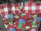 This listing is for a used, hand made tote bag. It's made of heavier home decor fabric that features blue hydrangeas on a striped red back ground. It is accented with band of plaid fabric. The inside is green floral with a large divided pocket on the side. It is in very good condition and perfect to take shopping, crafting, flea markets, or anywhere. . 1125-3 Please write if you have any questions.
