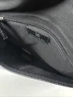 The B-Low The Belt Black Metal Bubble Studded Envelope Handbag is a small clutch handbag made of PVC with a metallic finish and studded accents. It features a button closure, inner dividers, and a strapless handle style. The bag is in a sleek black color with gold and silver hardware, making it suitable for both party/cocktail and casual occasions. This stylish handbag from the 2010-2019 collection by B-Low The Belt has a rectangular shape and measures 11 inches in width, 7 inches in height, and 6 inches in depth. See photos for condition and size.
