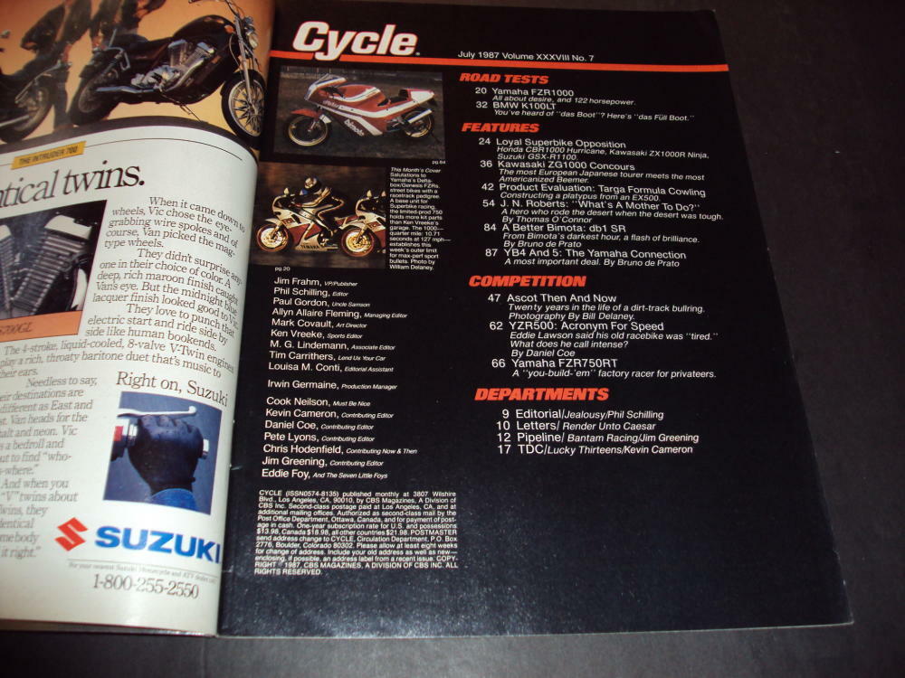 JJJ Collectibles Long-Lost Treasures from Swan's Magazine Mart (1930-2007) Magazines Music Memorabilia Comics Sign up for Newsletter One of the Long-Lost Treasures from Swan's Magazine Mart Vintage Issue Of Cycle Magazine July 1987 Average Condition: Exterior shows light to moderate wear, interior is very clean. All magazines come boarded and bagged Welcome to our selection of comic books, vintage magazines, music memorabilia, posters, records, toys, books, pulps and more. We have a total inventory of 5-10 million items. We have thousands of positive feedbacks from happy customers because we sell good products, we are honest, and we stand behind our policies. We've done our best to describe and display each item as accurately as possible, but we do welcome any questions you may have. If you like our selection, our prices, and our service, you might want to consider signing up on our store's mailing list. We will not give out your contact information to 3rd parties. Please add us to your list of favorite sellers and tell your friends. We accept PAYPAL, VISA, MASTERCARD, DISCOVER, and AMERICAN EXPRESS. Prompt payment is appreciated and required within seven days of purchase. We ship WORLDWIDE. We do combine shipping. If you are bidding on multiple auctions please let us know. Our international shipping costs are our ACTUAL costs for postage & materials. We endeavor to ship all items within 24 hours of receiving payment or by the next business day. Please email to let us know if your item does not arrive in a timely fashion. NOTE: Some International packages have to go First Class. First Class International cannot be tracked or insured. If you have questions or comments for us, please use the 'Ask seller a question' link above to contact us. If there is a problem with your purchase, for any reason, please contact us so that we can resolve it. We do have a return policy if you aren't happy. Just contact us by email or phone within three days of purchase, explain your problem, and if we can't make it right we will accept the return of the item in saleable condition. On receipt of the item, you will get your money back. This listing created with GLETech Multiple Selling Channel tools.