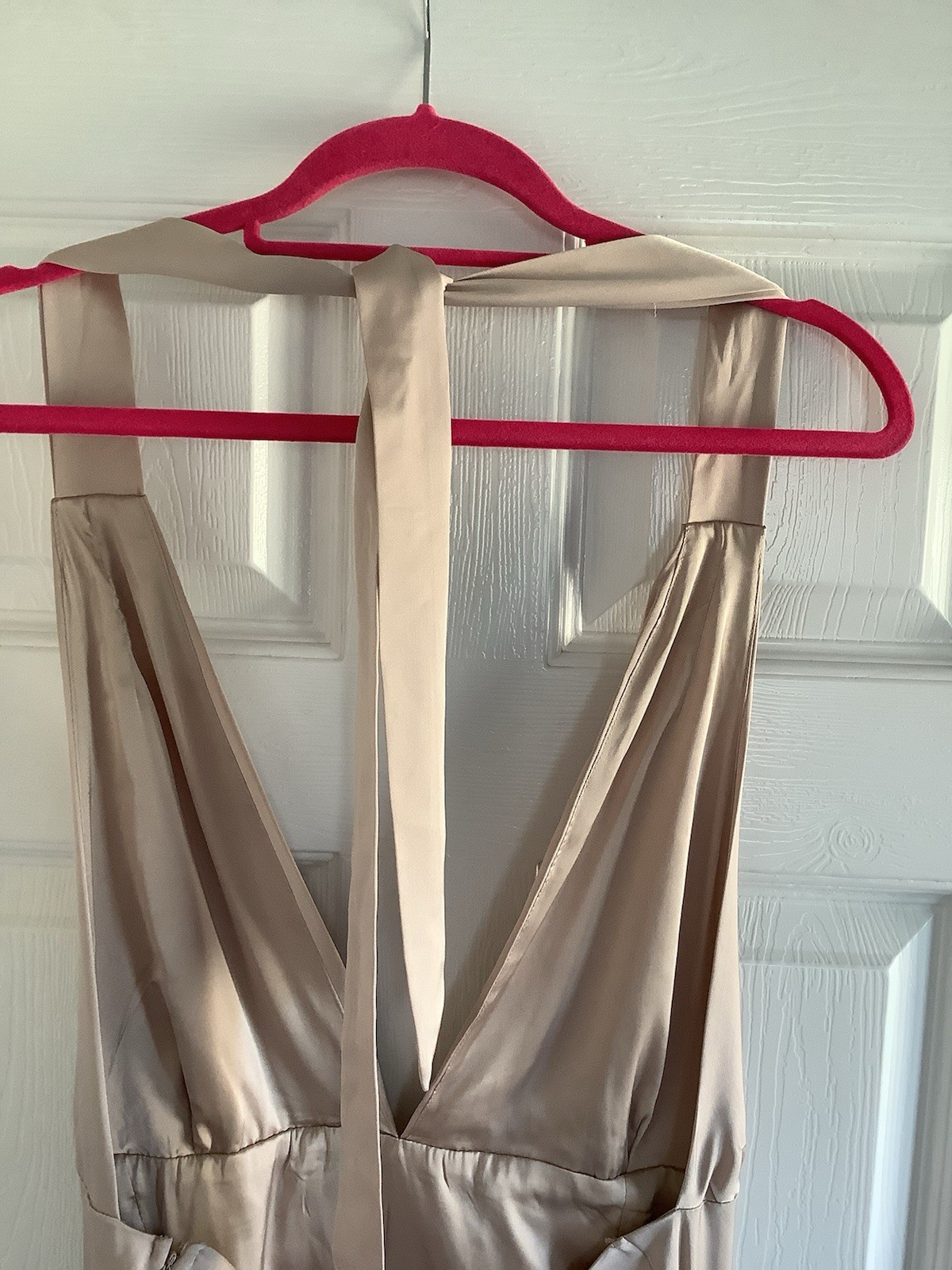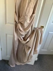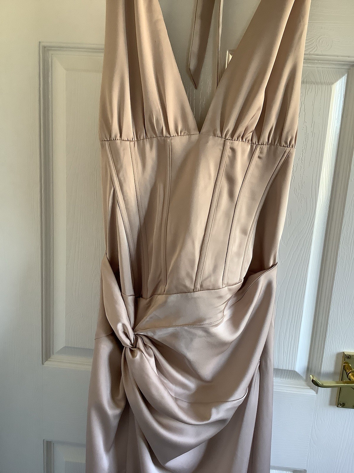 BNWT Stunning champagne satin corset style maxi dress with a wrap skirt. It is fully lined and has lacing detail to the back and a halterneck with flowing ribbon, side invisible zip. Ideal as a bridesmaid dress, prom dress or any black tie event, the colour is beautiful and won’t date. Smoke and pet free home.