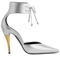 The product is a pair of Gucci high heel pumps in size 38 (US 8) that come in a silver color. They feature ankle cuffs for added style and flair. These shoes are brand new in the original box, making them a luxurious and high-end addition to any woman's shoe collection. With a price tag of $1,200, these Gucci pumps are sure to make a statement and elevate any outfit with their elegant design and high-quality craftsmanship.