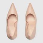 This product is a pair of BNWT (Brand New With Tags) Gucci women's high heel shoes in a light pink color. They feature a high top shoe shaft style with a pointed toe and a 105mm heel height. The shoes are a size 39.5 in EU sizing and 9.5 in US sizing. Made in Italy, they are crafted from leather, showcasing the iconic Gucci Interlocking G design. The outsole material is leather, adding to the luxury and quality of the shoe. Subtle House details add a logo touch to this pair of high heel pumps. Crafted from light pink leather, a Double G detail on the heel enhances the elegance of the style's classic silhouette. Light pink Women's Double G detail on heel Pointed toe Leather sole High heel 105mm heel height Made in Italy