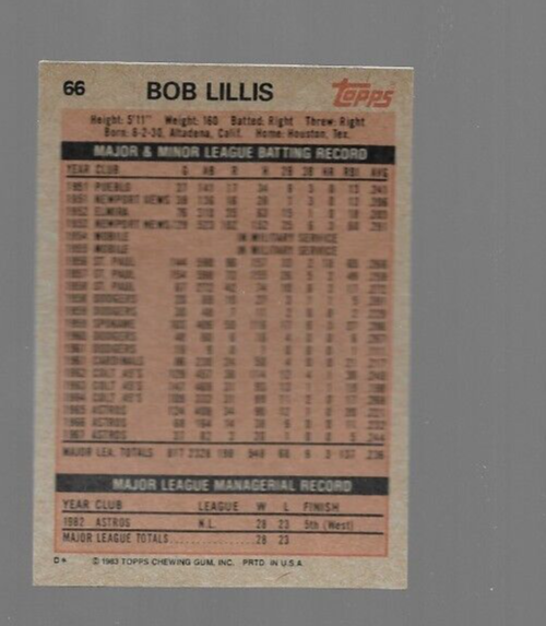 PLEASE READ THROUGHOUT DESCRIPTION. Good day. No insurance. Please NO e-Checks, they take too much time to clear . FREE shipping to Canada and USA and $9 rest of the world. BOB LILLIS 1983 TOPPS #66 MANAGER HOUSTON ASTROS Feel free to ask questions. NO LOCAL PICKUP . PAYPAL is of course the preferred method of payment. Thanks for looking and happy bidding