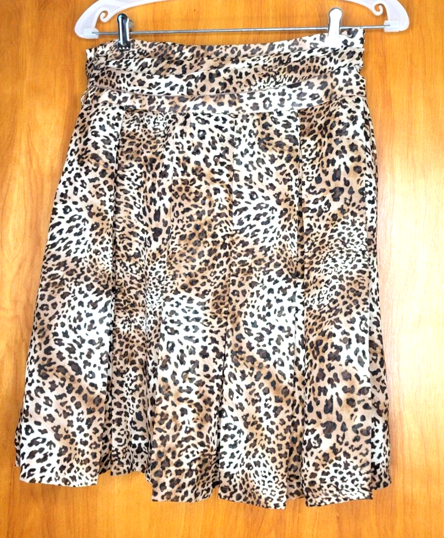 Cute Bobby J lightweight cheetah pleated print skirt. Polyester with brown lining. Belt loops and sash/scarf style belt. Hidden side zip. Very nice condition. Machine washable. Length: 21"