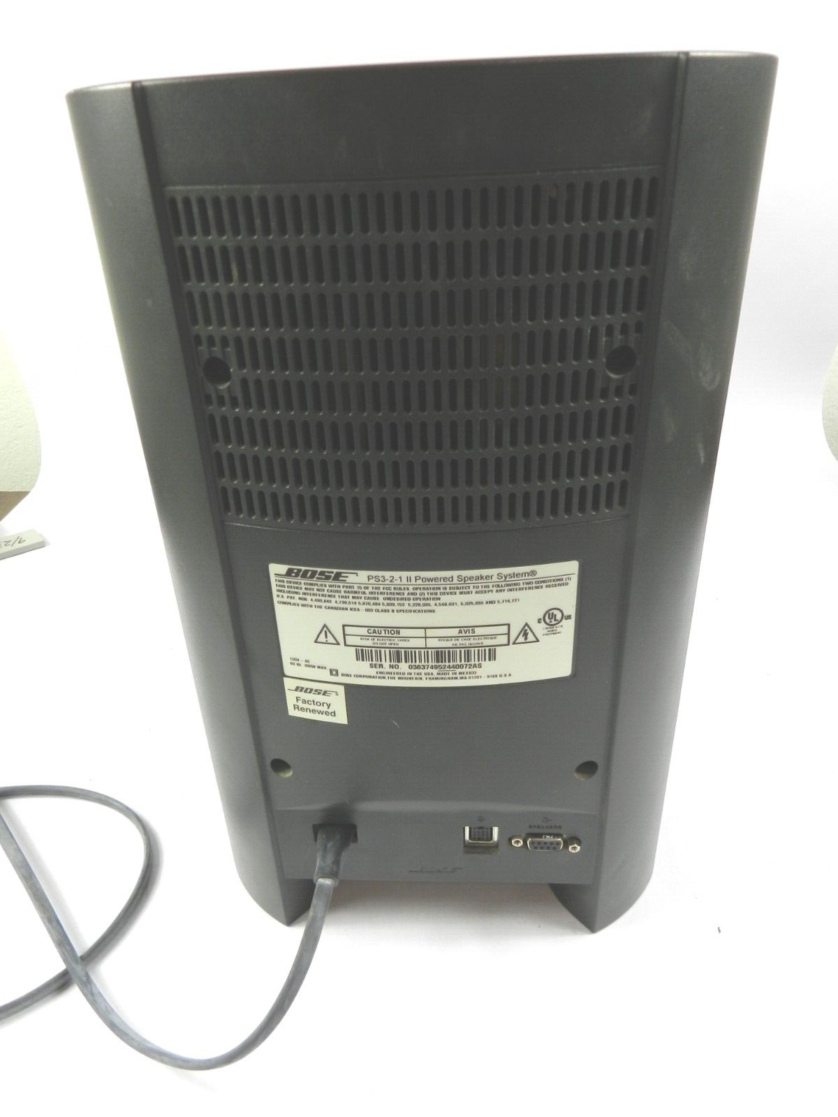 Very good condition. Very clean. See photos. Very minor scuffs or scrapes. Tested and in Good Working Condition. This is a Genuine OEM BOSE PS3-2-1 II Powered Speaker System Subwoofer. This was a previously "Factory Renewed" product. Genuine OEM BOSE power cord is included. Other connecter cables are not included. Comes as pictured. IF YOU NEED TO RETURN AN ITEM FOR ANY REASON PLEASE CONTACT US IN ADVANCE AS A FIRST STEP, PLEASE DO NOT INITIATE A RETURN WITHOUT CONTACTING US FIRST. WE WILL BE PROMPT IN REPLYING AND DO OUR BEST TO RESOLVE THE ISSUE OR INITIATE THE REFUND IMMEDIATELY FOR YOU. THANK YOU. Returns Always a 30 day return policy. If you need to return an item for any reason please contact us in advance as a first step, please do not initiate a return without contacting us first. We will be prompt in replying. Feedback If there is a problem with your purchase please PLEASE allow us the chance to resolve the issue before leaving negative feedback and to earn your highest feedback ratings. Descriptions All attempts are made to describe and photograph items as accurately as possible to earn your highest feedback ratings. Please look closely at the photos as they are part of the description. Combined Shipping We will combine shipping, Auctions: If bidding on multiple items just wait until an invoice is sent to you to pay a single shipping total. BIN: If purchasing multiple buy-it-now items from outside the U.S. inform us before purchasing so we can make arrangements for a single shipping price. Thank you.