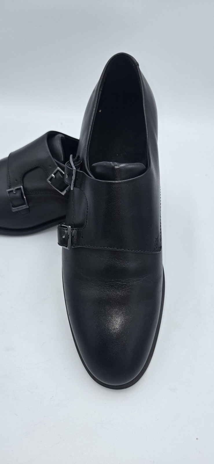 Brand: BOSS by Hugo Boss Style: Colby double-buckle monk strap dress shoes with a sleek rounded toe. Gender: Mens Size: US 7.5 (per purchase paperwork) Color: Black Materials: Smooth leather upper with synthetic outsole featuring fine tread and low stacked heel. Details: Double monk strap closure with BOSS-branded metal buckles, closed heel counter, clean minimalist vamp, BOSS logo stamped at heel and outsole. UPC: 15344105076 (from purchase paperwork shown in photos)