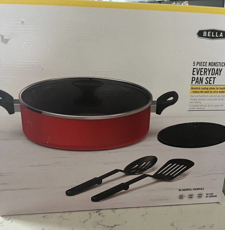 BELLA 5-Pc. Nonstick New BELLA 5-Pc. Nonstick cookware coating free of BPA, PFOA and PFOS Perfect for frying bigger portions or slow simmering a sauce, this jumbo cooker from Bella is in quick-heating aluminum with a nonstick coating. It comes with black essential utensils plus a trivet. Set includes 11" jumbo cooker, silicone trivet, two utensils Fast, even-heating aluminum Nonstick coating free of BPA, PFOA and PFOS Compatible with gas, electric, glass and ceramic stovetops Aluminum; utensils: nylon Dishwasher safe Imported Listing and template services provided by inkFrog