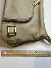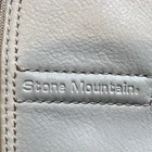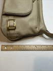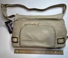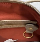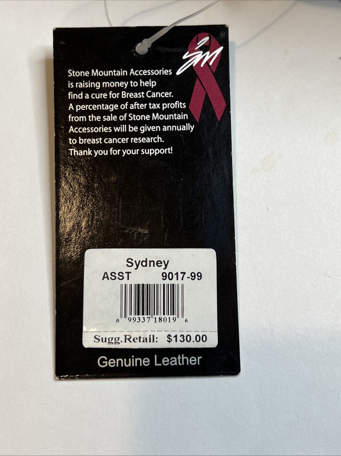 This BRAND NEW Stone Mountain Genuine Leather Handbag, "Sydney," is a large rectangular shoulder bag with a zip closure and almond-colored leather handles/straps. It features gold hardware accents, inner and outer pockets, an adjustable strap, and a key clip. The handbag is designed for occasions such as travel, weddings, casual outings, workwear, and business meetings. The exterior is crafted from genuine leather with a fabric lining in orange, making it a stylish and functional accessory for women who appreciate designer quality.