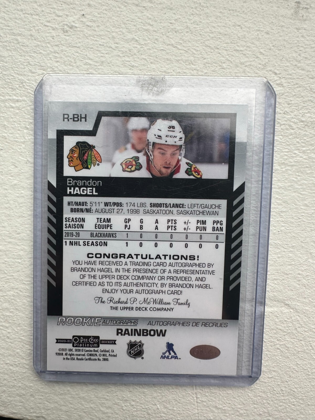 BRANDON HAGEL 2020-21 O-PEE-CHEE Platinum ROOKIE AUTO trading card featuring a hard-signed autograph from the Chicago Blackhawks player. This National Hockey League collectible is an original, licensed reprint by Upper Deck, with autograph authentication. Perfect for fans and collectors of hockey memorabilia, this 20 Pt. card is from the 2020-21 season and showcases Hagel as a rookie in the sport. Add this English-language card to your sports trading card collection today.