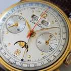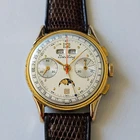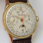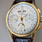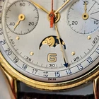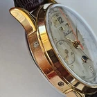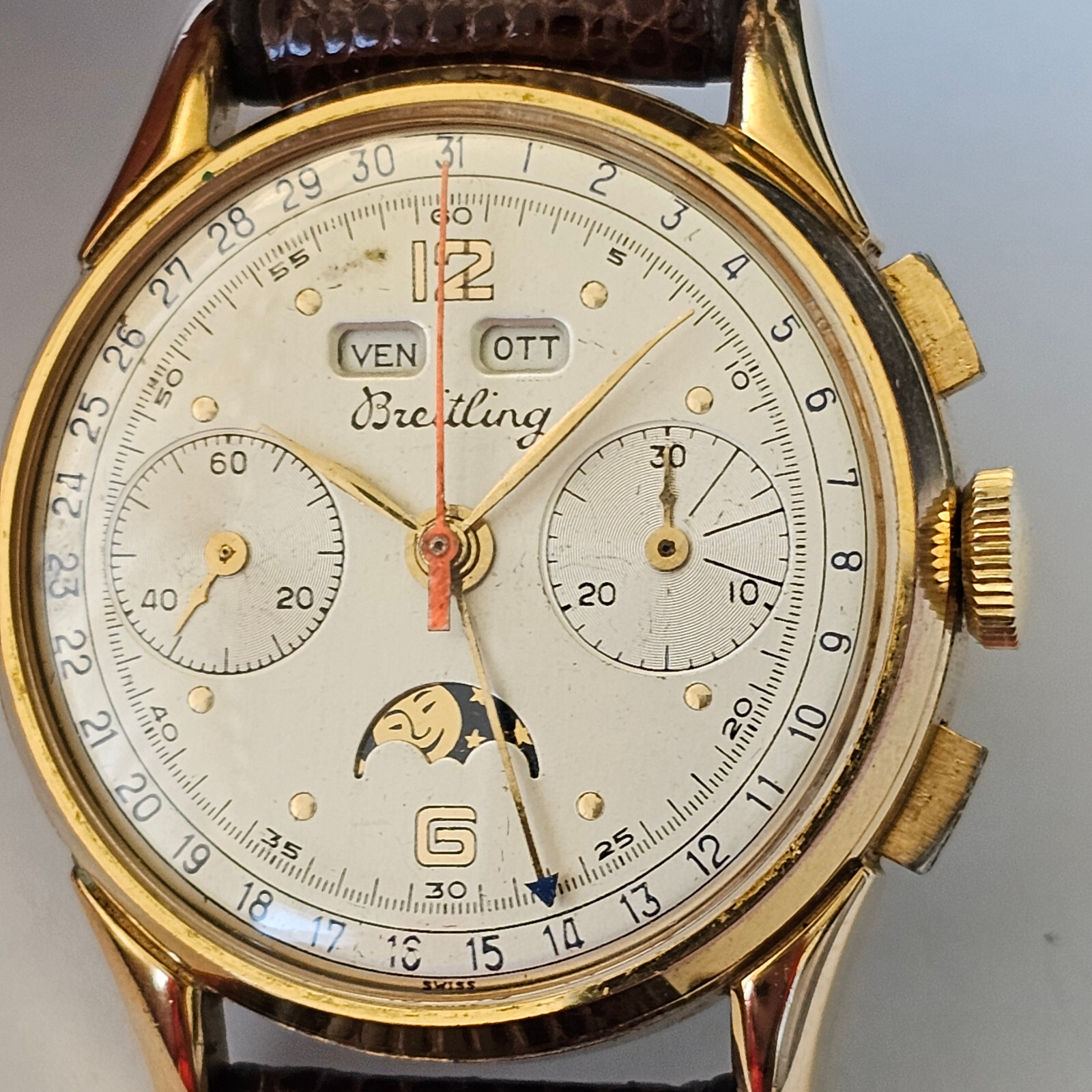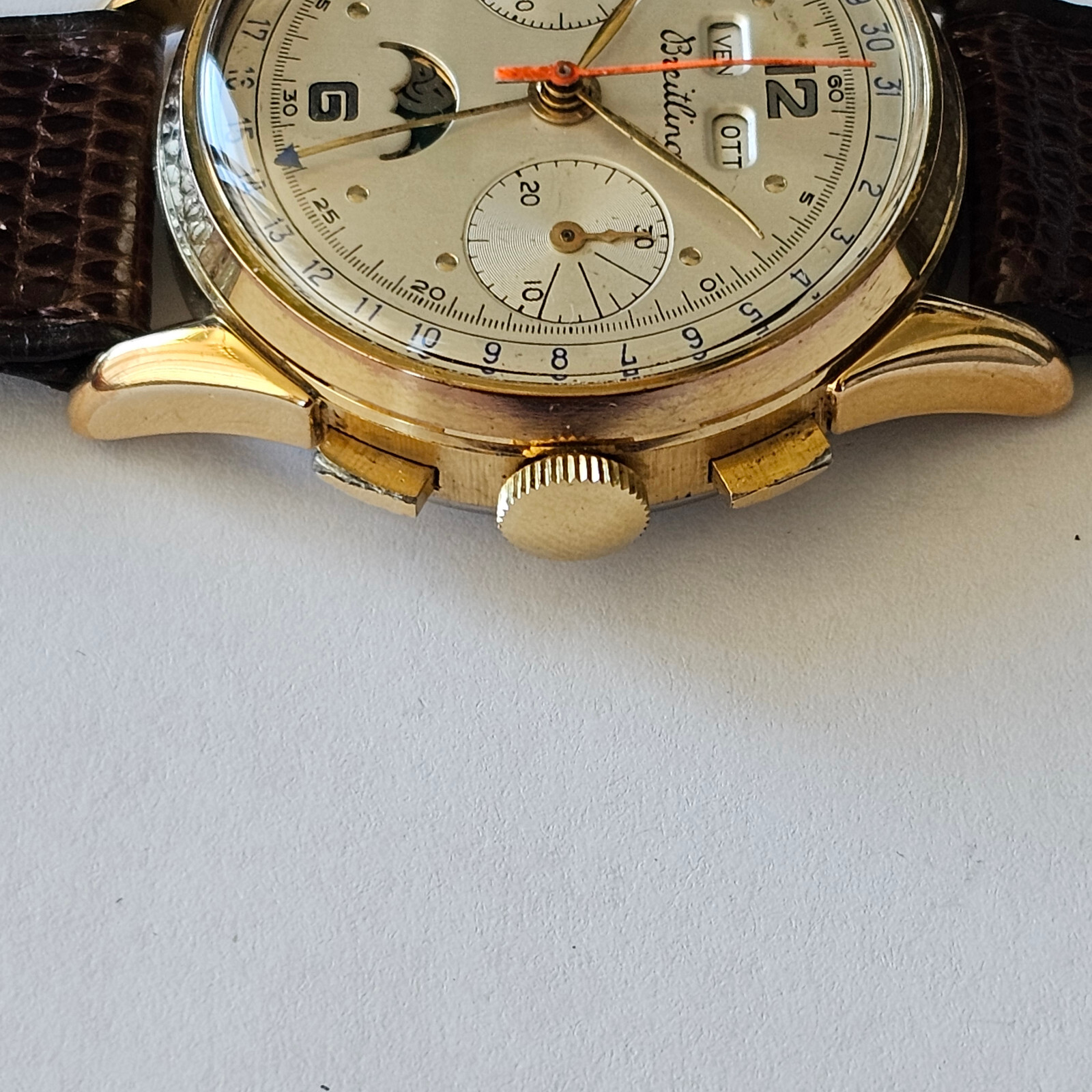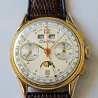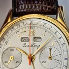 "BREITLING",MODELLO "DATORA", "CHRONOGRAPH QUANTIEME-TRIPLE DATE MOONPHASE", OVVERO CRONOGRAFO A DUE CONTATORI CON CALENDARIO COMPLETO E FASI LUNARI.ANNI 50,CON BELLA CASSA PLACCATA IN ORO E FONDELLO IN ACCIAIO SERRATO A SCATTO.CORRETTORI RAPIDI DEL CALENDARIO SULLA CARRURE AD ORE 8 E 10. SPETTACOLARE QUADRANTE,OVVIAMENTE ORIGINALE ED IN OTTIME CONDIZIONI,COME DA FOTO.VETRO PLEXI IN OTTIME CONDIZIONI.CASSA PLACCATA IN ORO CON FONDELLO SERRATO A SCATTO IN ACCIAIO FIRMATO ALL'INTERNO.OROLOGIO BEN FUNZIONANTE,ANCHE SE NON DI RECENTE REVISIONATO. MONTA UNA MECCANICA DI MANIFATTURA SVIZZERA,RARISSIMO CALIBRO VENUS 195,TUTTA RODIATA E FIRMATA. OROLOGIO TUTTO FIRMATO SU QUADRANTE,CASSA E MECCANICA. LA CASSA MISURA 36 ESCLUSE ANSE E CORONA ( 38,2 X 44,4 MM. CON CORONA ED ANSE). OROLOGIO MOLTO RARO ED AFFASCINANTE.DIFFICILE DA TROVARE IN QUESTE CONDIZIONI!!! VENDO E SPEDISCO IN TUTTO IL MONDO.GLI UTENTI STRANIERI DEVONO CHIEDERE PRIMA I COSTI DELLA SPEDIZIONE. SPEDIZIONE GRATUITA IN ITALIA ESCLUSIVAMENTE CON CORRIERE PRIVATO . PAGAMENTO CON PAYPAL,BONIFICO BANCARIO O VAGLIA POSTALE.