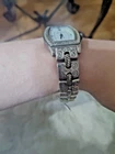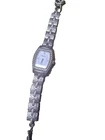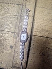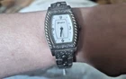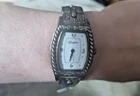 This Brighton "Toledo" ladies watch features an ornate two-tone design with gold and silver plated accents. It has Arabic numerals, a 12-hour dial, and a tonneau/barrel shape. The watch has a bracelet band and a white dial with non-numeric hour marks. It is a luxury and classic style timepiece with a quartz movement. It has an engraved case finish. It does not come with the original box or packaging.